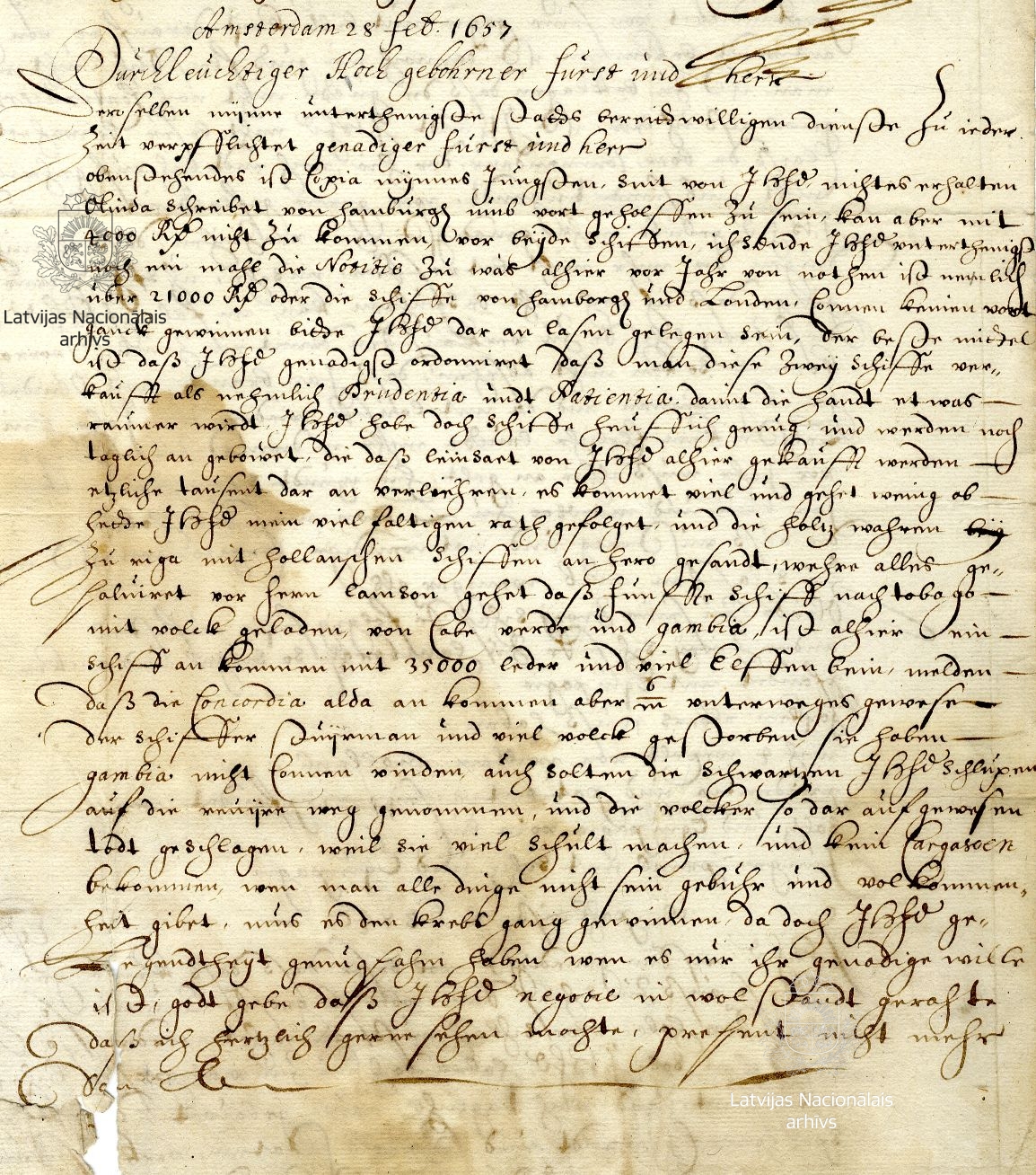 8. Letter from factor Henry Momber to Duke James. Amsterdam, 28 February 1657. Copy. LVVA, collection 7363, inventory 3, file 439, p. 11.
