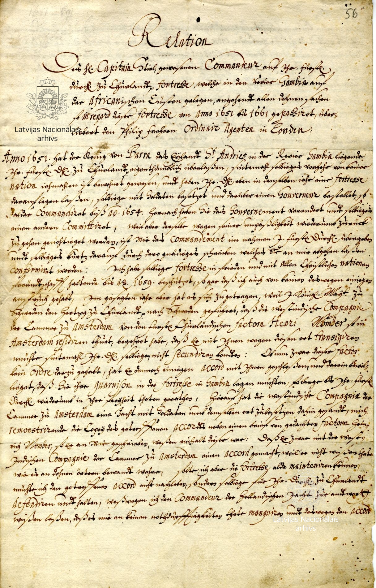 9. Report from Captain Otto Stiel (also Styl), commander of the Duke of Courland’s base in Gambia. London, 13 December 1661. Transcript. LVVA, collection 554, inventory 2, file 2982, pp. 56–57.
