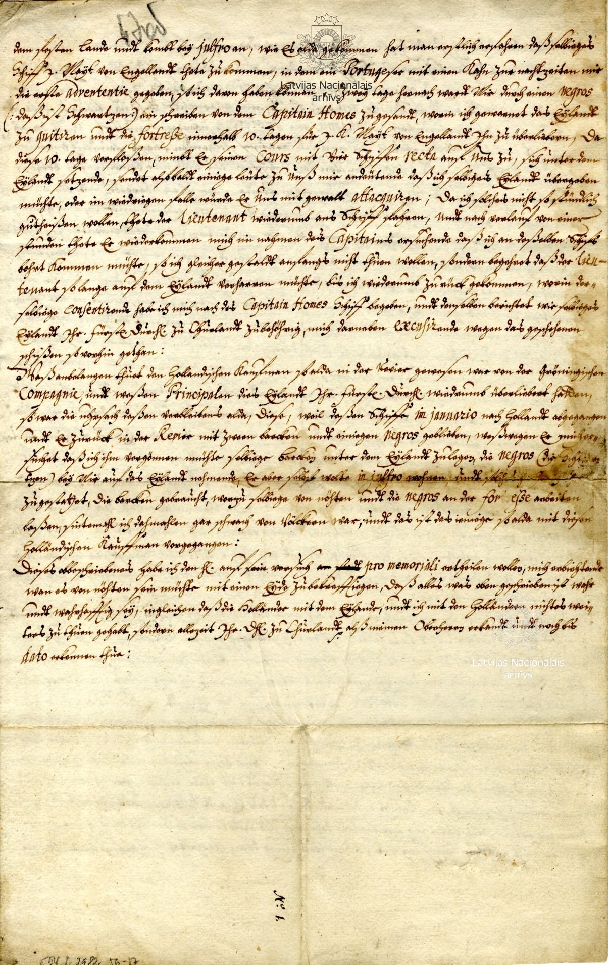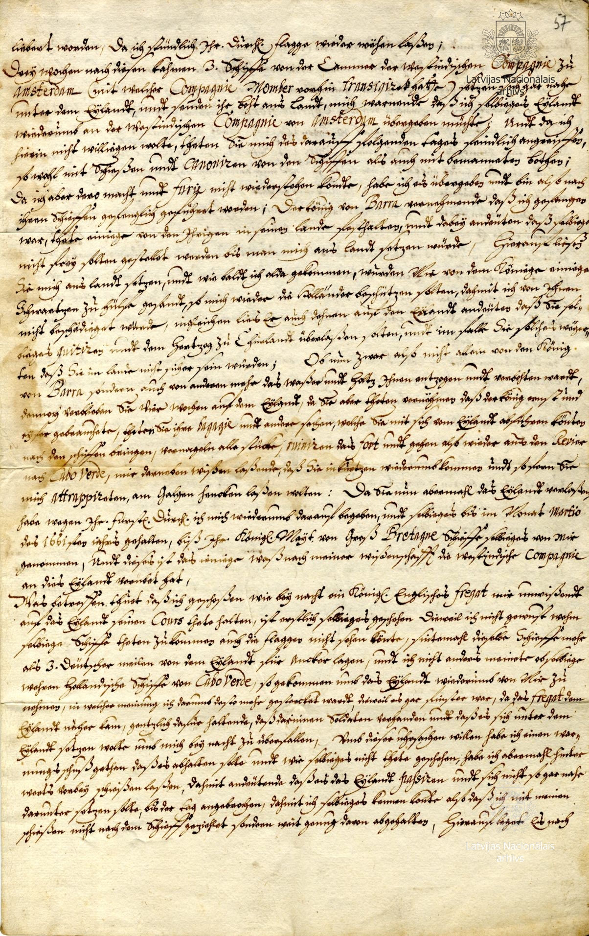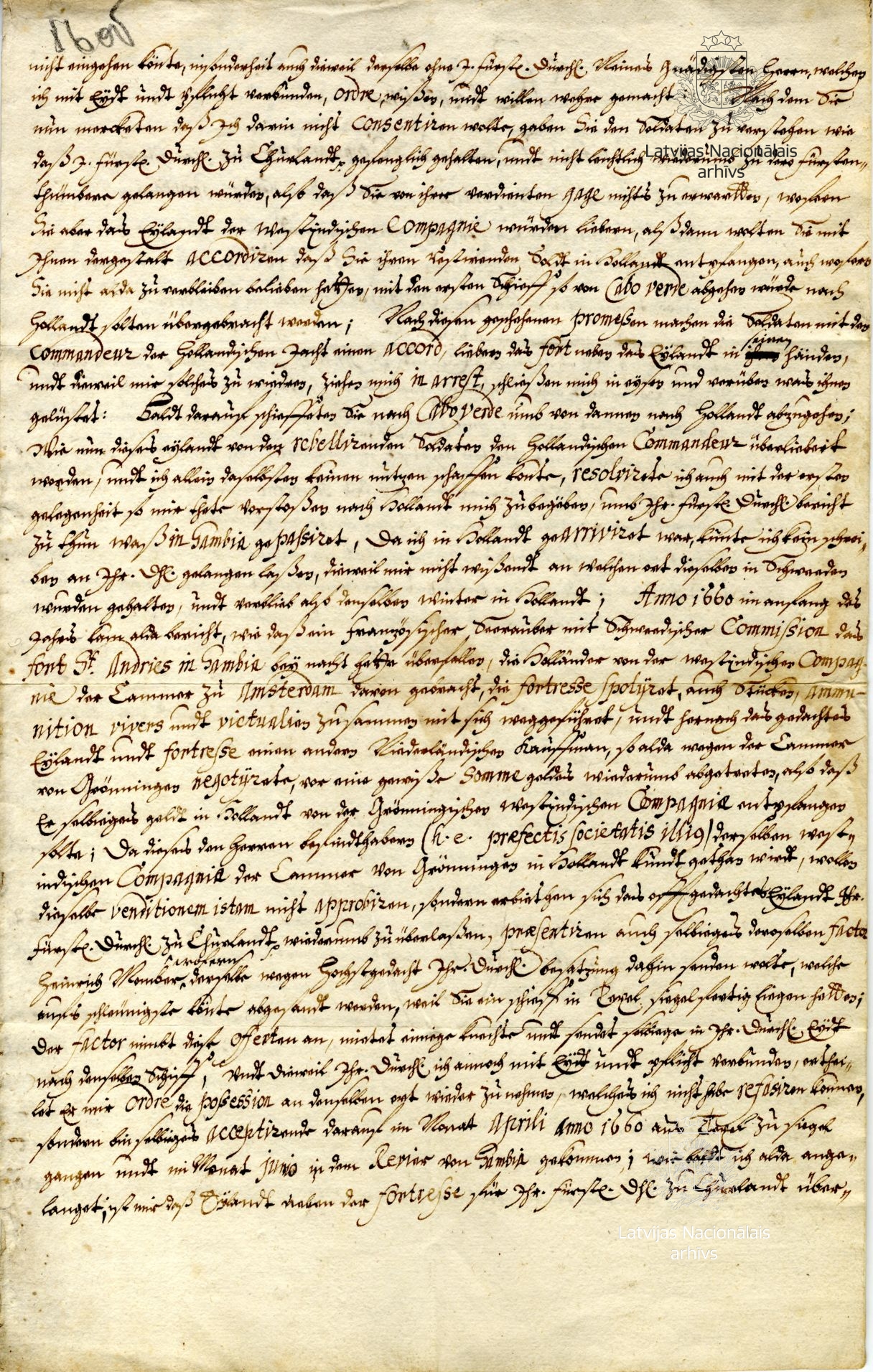 The report tells of events in 1659–1661, when, taking advantage of James’s incarceration by the Swedes, the Dutch and English took over the duke’s possessions in Gambia. First, in 1659, representatives of the Amsterdam Chamber of the West India Company (WIC) convinced the garrison of the fort on St Andrew’s Island to leave, asserting that because the duke was a prisoner they had no hope of receiving their pay. The mutinous soldiers arrested Stiel and handed over the fort to the Dutch; he himself was also forced to leave for Holland. There he received word that the fort had been plundered by French corsairs. After this, the fort was taken over by the WIC Groningen Chamber, which returned it to the Courlanders. Stiel returned to Gambia in June 1660, but three weeks later the fort was attacked by ships of the WIC Amsterdam Chamber, forcing Stiel to surrender. Since they did not receive support from the natives, the Dutch abandoned the fort a month later. Stiel continued his activities up to March 1661, when a squadron of ships of the King of England, commanded by Robert Holmes, took over the fort, and the Courlanders were forced to leave St Andrew’s Island yet again – this time, never to return.