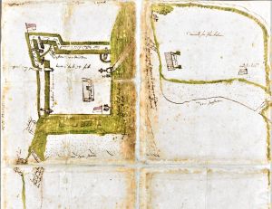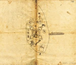 The plan has been sketched on the back of the map of the island of Tobago. It shows the first steps in the establishment of the colony. The fort was surrounded by earthworks, which had a single bastion. Inside, a building is marked where church services were held. Outside were warehouses, a plantation and a cemetery. Flags of the Duchy of Courland flew above the earthworks.