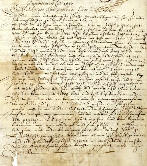 Momber repeats the suggestion he had put forward already in a letter on 17 February that the ships Prudentia (Prudence) and Patientia should be sold. He considered it would be more profitable for the duke to undertake timber exports in Dutch ships from the port of Riga. Apart from this, Momber reports that a ship had arrived in Amsterdam, the captain of which had reported encountering the duke’s ship Concordia (Concord) in Gambia. It had spent more than half a year on the voyage, and a large part of the crew, including the captain and helmsman, had died.