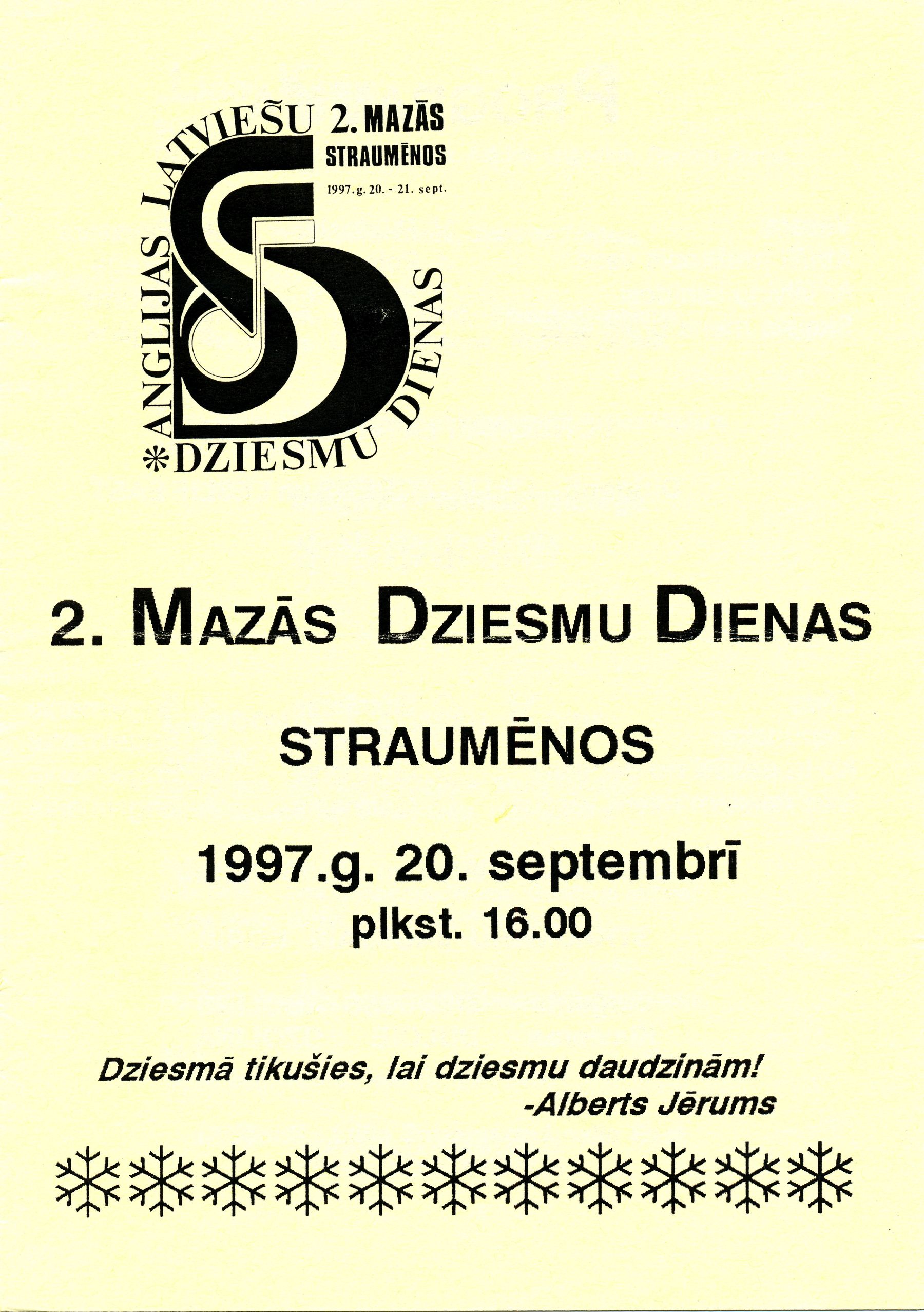 As Latvians started leaving refugee camps, the first English Latvian Song Days were held in June 1949 in London, which were followed by the Northern England Song Days in Leeds the same year and the Song Days in Leicester a year later. Until 1986, English Latvian Song Days were regularly held in various cities, and in later years, smaller-scale song days were held at Straumēni (Catthorpe Manor), the countryside estate of the Daugavas Vanagi Foundation.