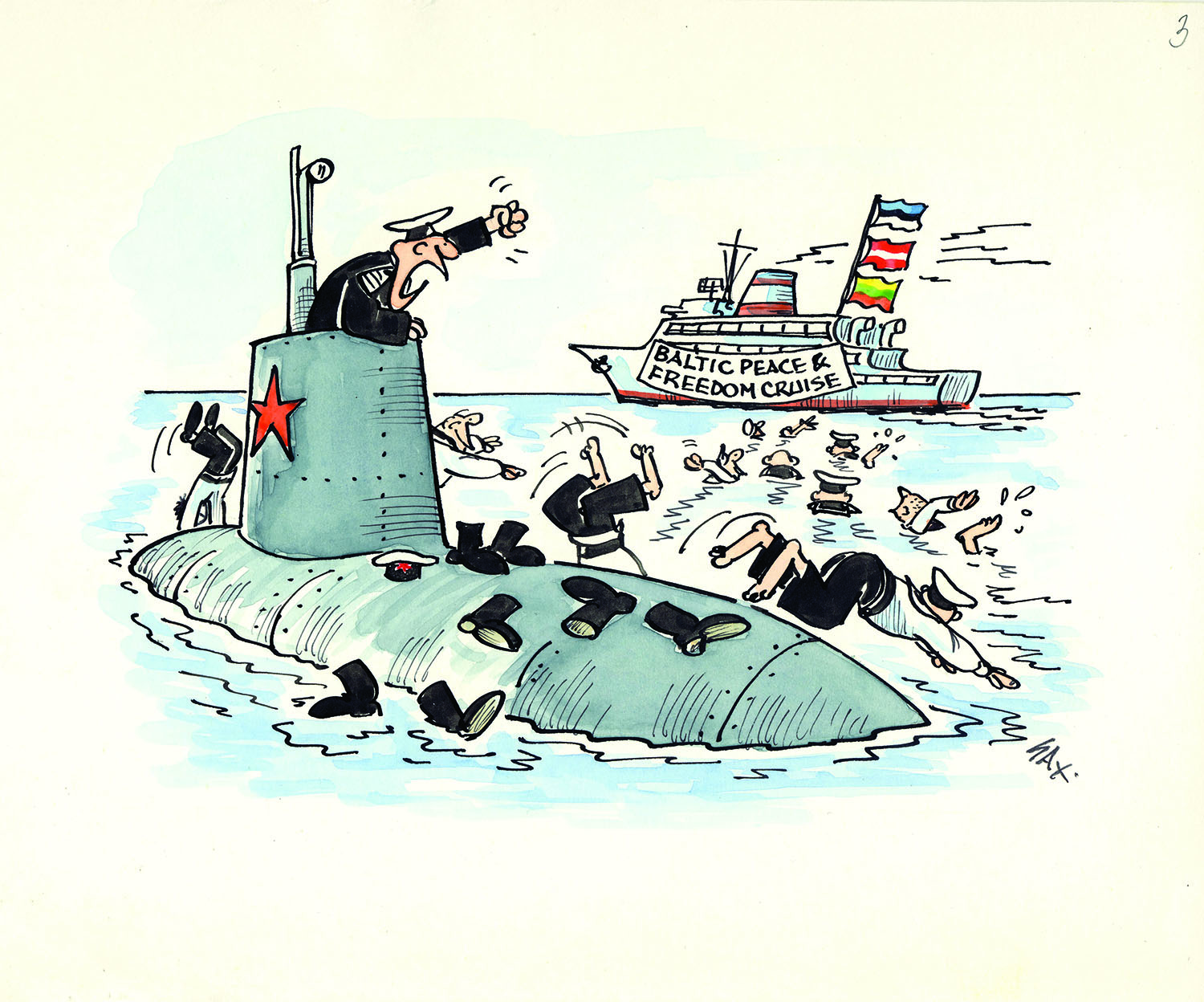 SAX is one of the few Latvian cartoonists who has gained the attention of world art critics. Arriving in England in 1947. After several years of studying art, SAX decided to concentrate his creative work on drawing cartoons. From 1957 he began publishing in different English newspapers and magazines, finally achieving success in the “Daily Mirror”, “Titbits”, “The Daily Express” and also “La Settimana Enigmistica” in Italy. all of which regularly published his cartoons.