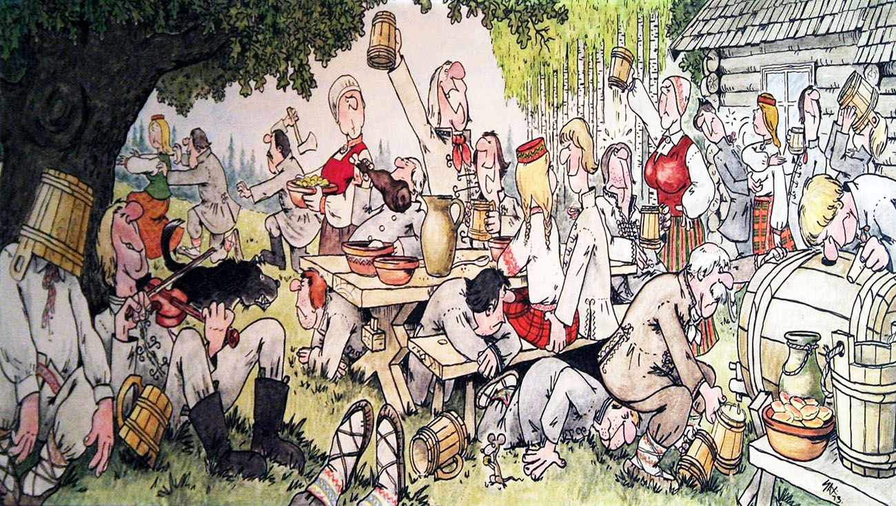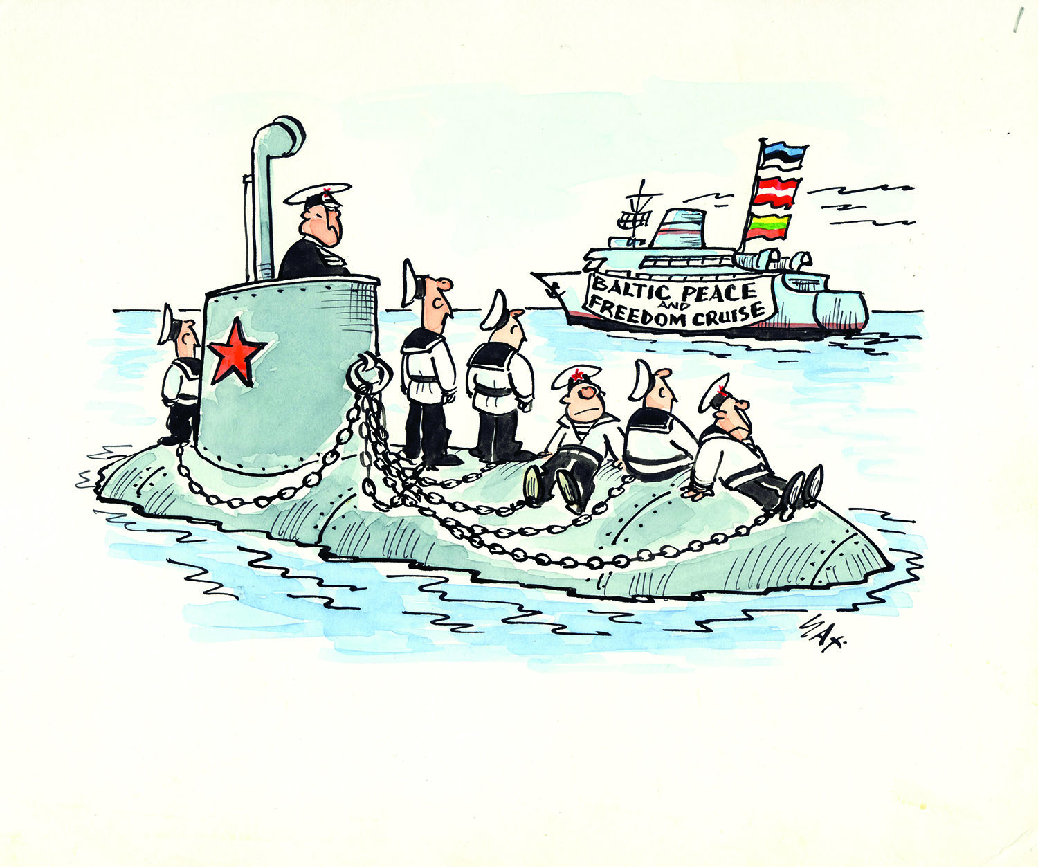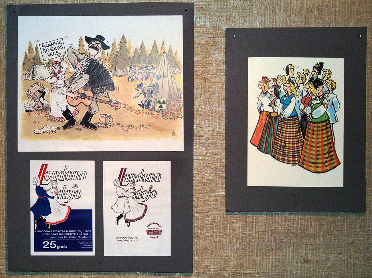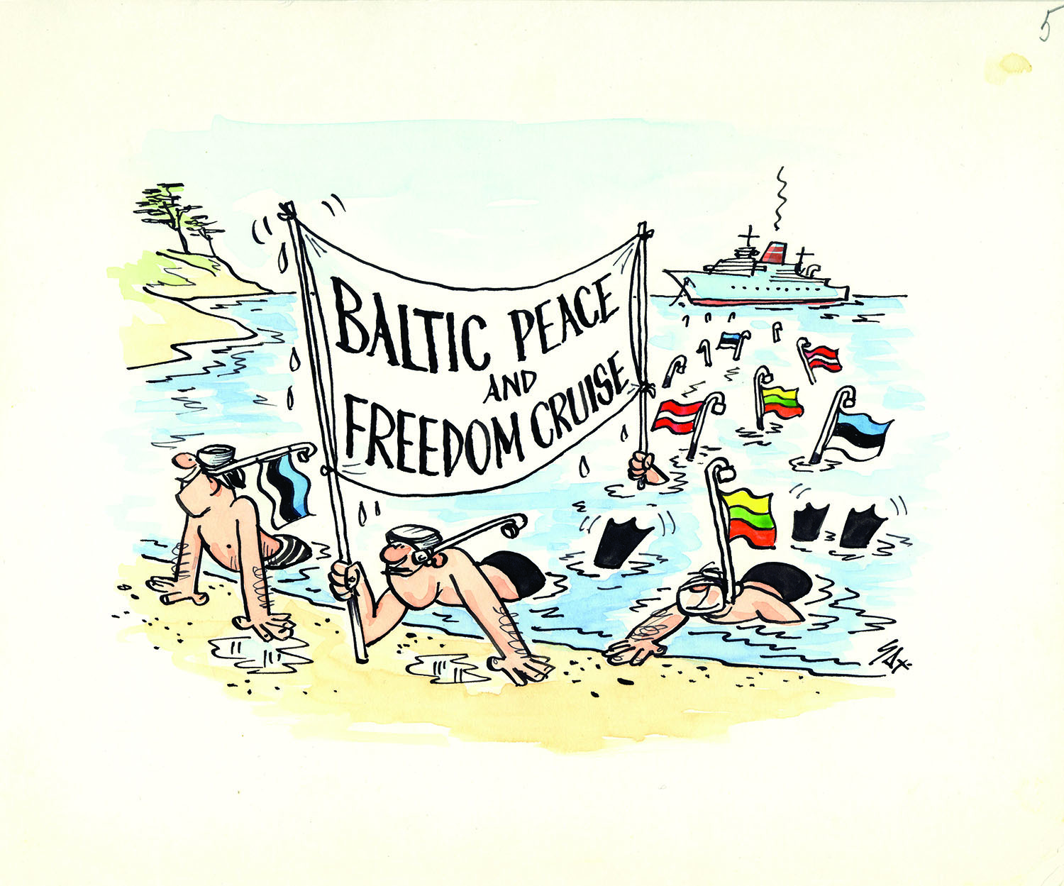 The artist created many cartoons related to Latvian community events in exile. A special series of his cartoons was dedicated to the Baltic Peace and Freedom Cruise in 1985. These cartoons were used in a number of informative publications, postcards, stamps and periodicals.