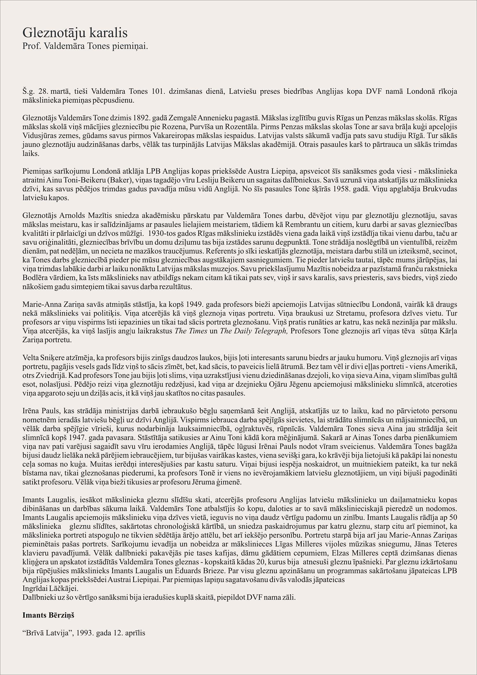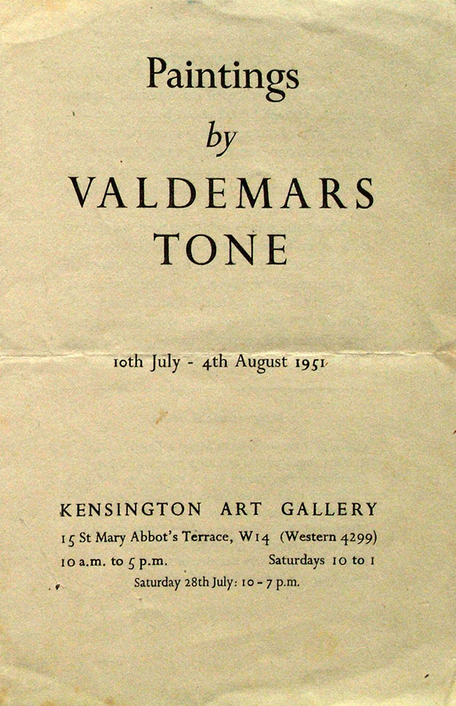 Since 1947, many Latvian artists who had received their art education in pre-war Latvia moved to Great Britain. Among them were professor Valdemārs Tone (1892-1958), a professor at the Latvian Academy of Arts, and the graduates of the academy: painters Arnolds Mazītis (1913-2002), Alfons Michailovskis (1899-1966), Kārlis Grūbe (1902-1998) and graphic artist, calligrapher Arvīds Alexanders Sodums (b.1919). Rarely were any of the immigrants able to work in their profession, because the strict rules of a two-year employment contract, staying in a certain place without changing it, restricted freedom of action.