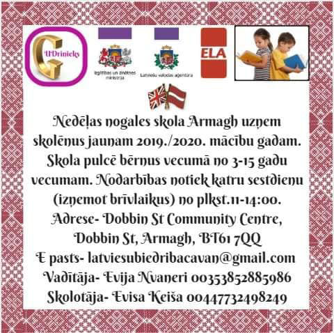 After Latvia regained its independence in 1991, and especially after Latvia's accession to the European Union in 2004, a large number of Latvians moved to Northern Ireland. They began to organise activities mainly in the areas near the border with the Republic of Ireland and maintain close ties with Ireland’s Latvians. They sing in Irish choirs, dance in Irish dance groups, work in the crafts studio “Likteņdzirnas” and take their children to Latvian mother-tongue weekend schools in Ireland, especially in Dublin and other towns such as Cavan, which from Northern Ireland is just a 20-minute car ride away. The Latvian Society of Cavan (also known as the Latvian Society of Cavan and Northern Ireland) organises events in both Ireland and in Northern Ireland particularly in Armagh. There are weekend schools in Cavan and Armagh ("Zinītis in Cavan since 2016 and "Gudrinieks" in Armagh since 2019). Children attending these schools are from both side of the border.