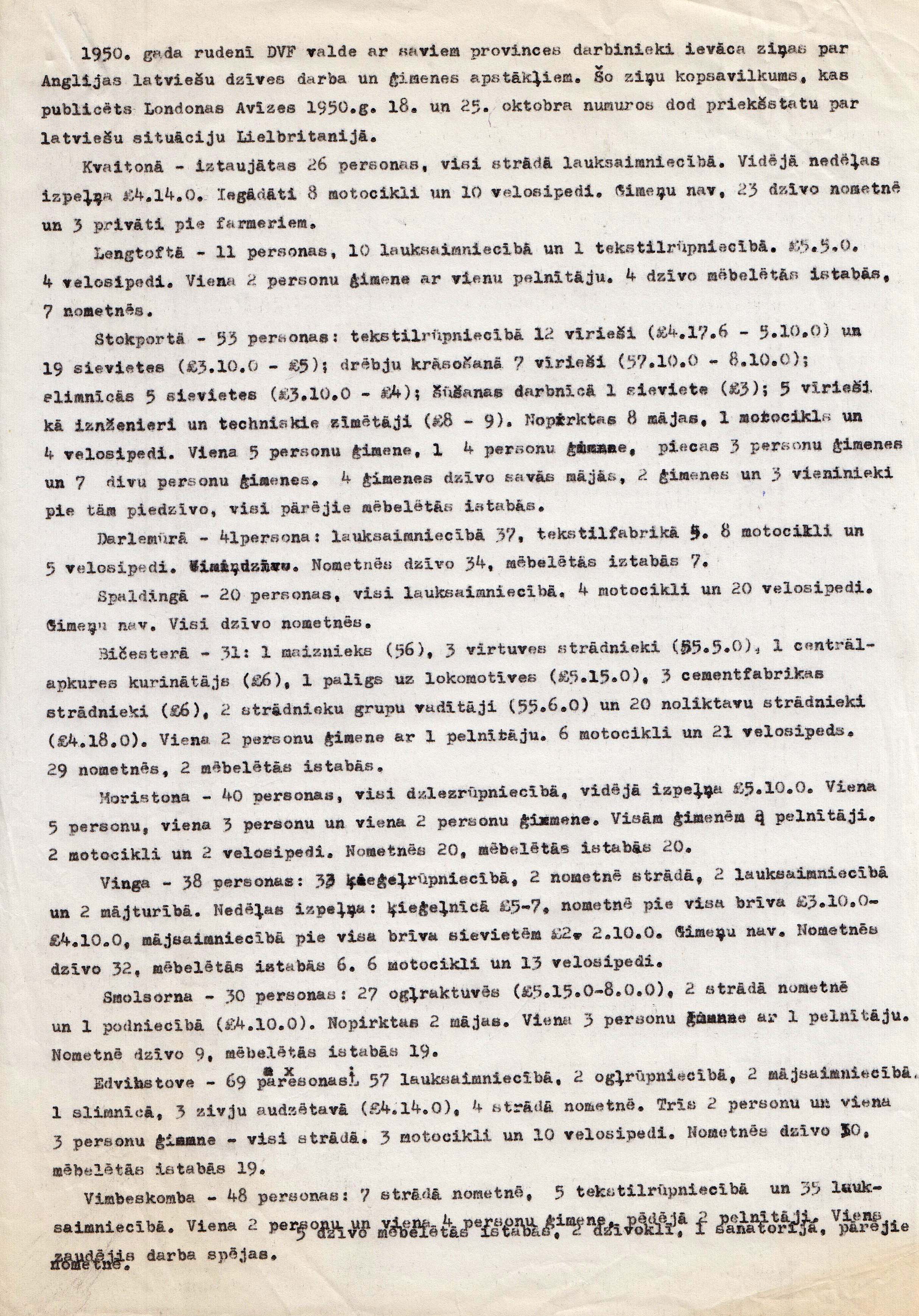 When the initial compulsory employment contracts ended, the exodus to other countries began, or the Latvians moved to cities, purchased personal homes, and established families. At that point the number of branches and members also decreased significantly. However, over time, the number of members increased again, as the DVF, through its activities, gained a great deal of responsiveness in Latvian society. In 1952, the DVF was registered as a care organisation. In order to work successfully, the DVF bought a house in London in 1950, where not only were permanent residents living, but also set up a club and library and meeting rooms . The editorial board of the “Londonas Avize” and the office of the Latvian National Council in Great Britain (LNPL) were also located there. Later, houses were purchased by DVF branches in Bradford, Leeds, Halifax, Coventry, Doncaster, Huddersfield, Bolton and Nottingham, where clubs, libraries and rooms were set up for various self-service groups, as well as organisation events. In 1975, the DVF acquired the rural property Catthorpe Manor (“Straumēni”) where a cultural and elderly care centre was set up. In 2000, DVF released the book "Straumen in England in 25 Years" (“Straumēni Anglijā 25 gados”) edited by Indulis Kažociņš.