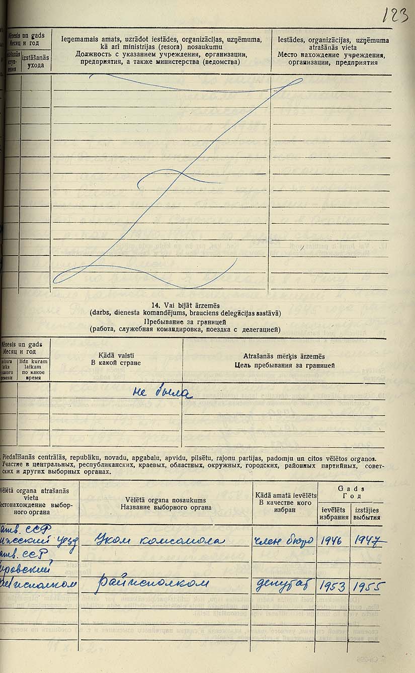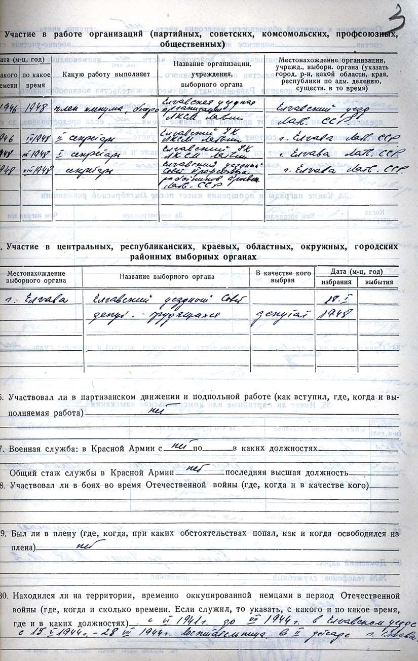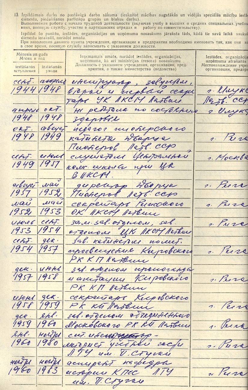 Pionieru pils direktores Stefanidas Jemeļjanovas personālā kadru uzskaites lapa.