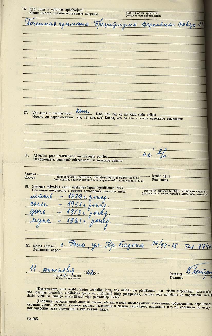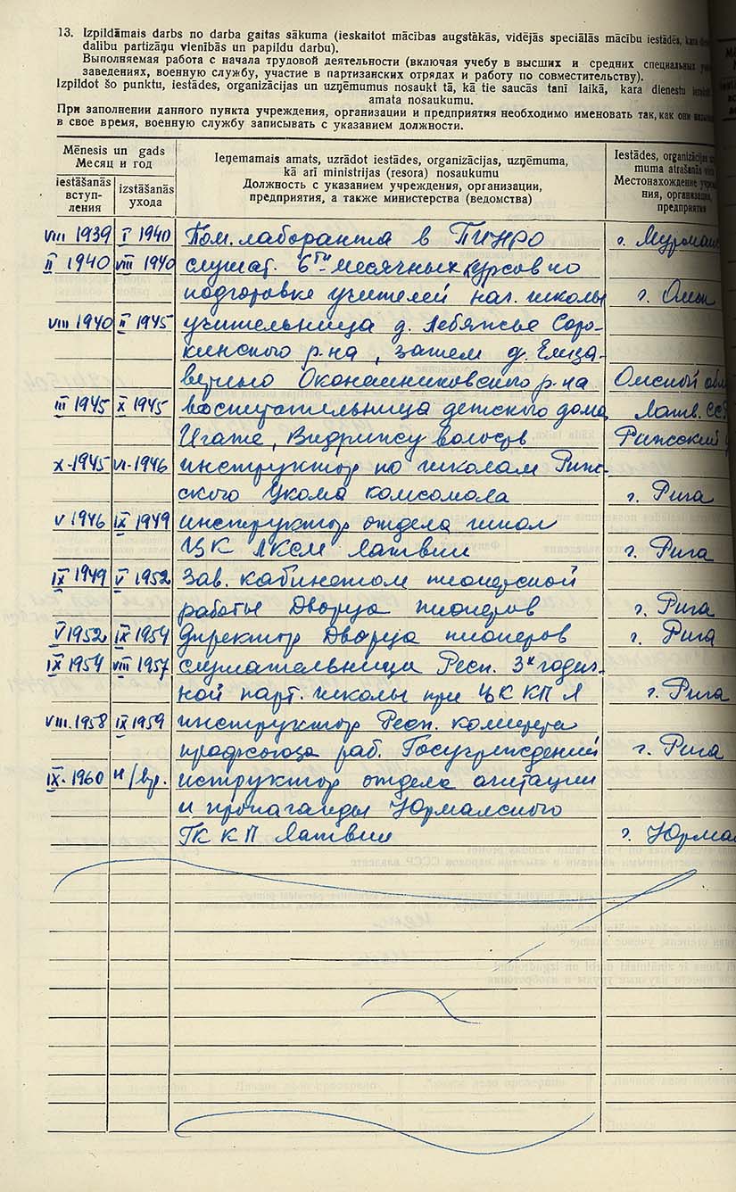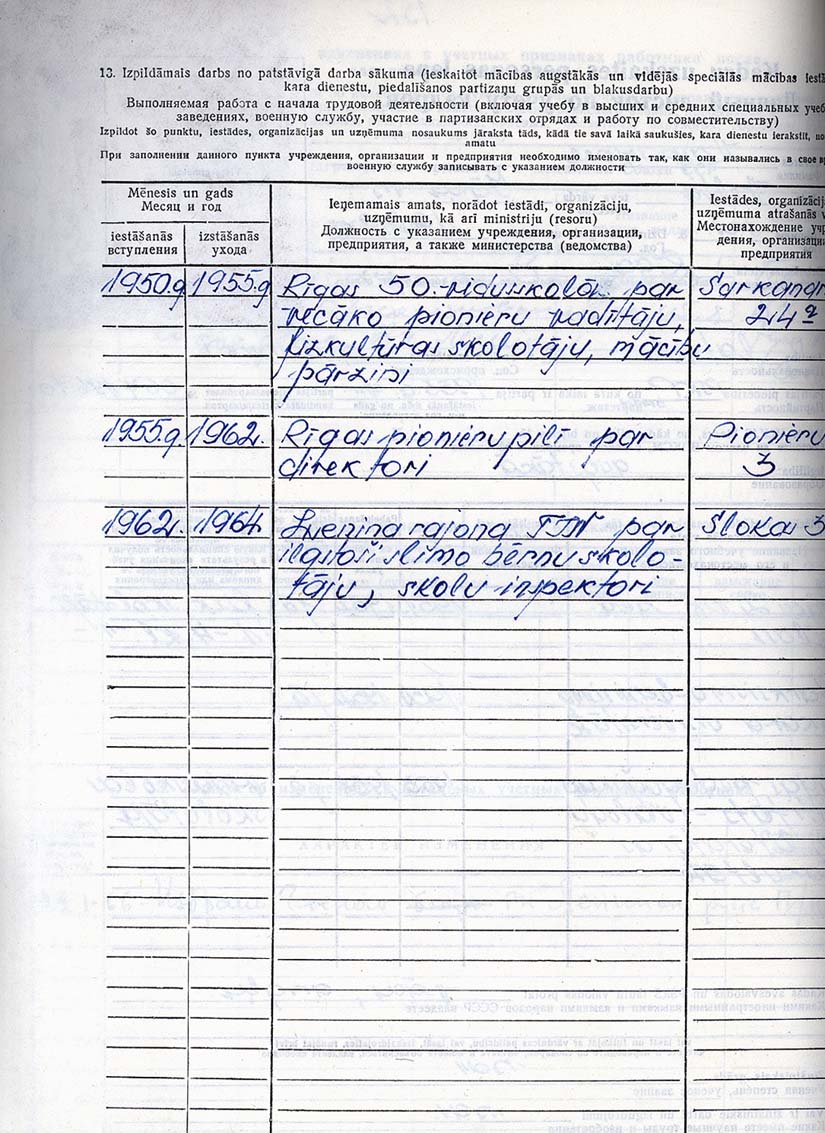Pionieru pils direktores Vilmas Pētersones personālā kadru uzskaites lapa.