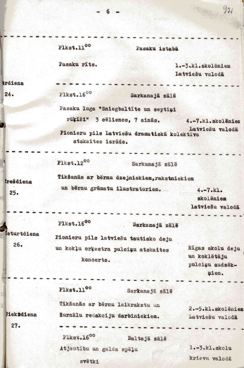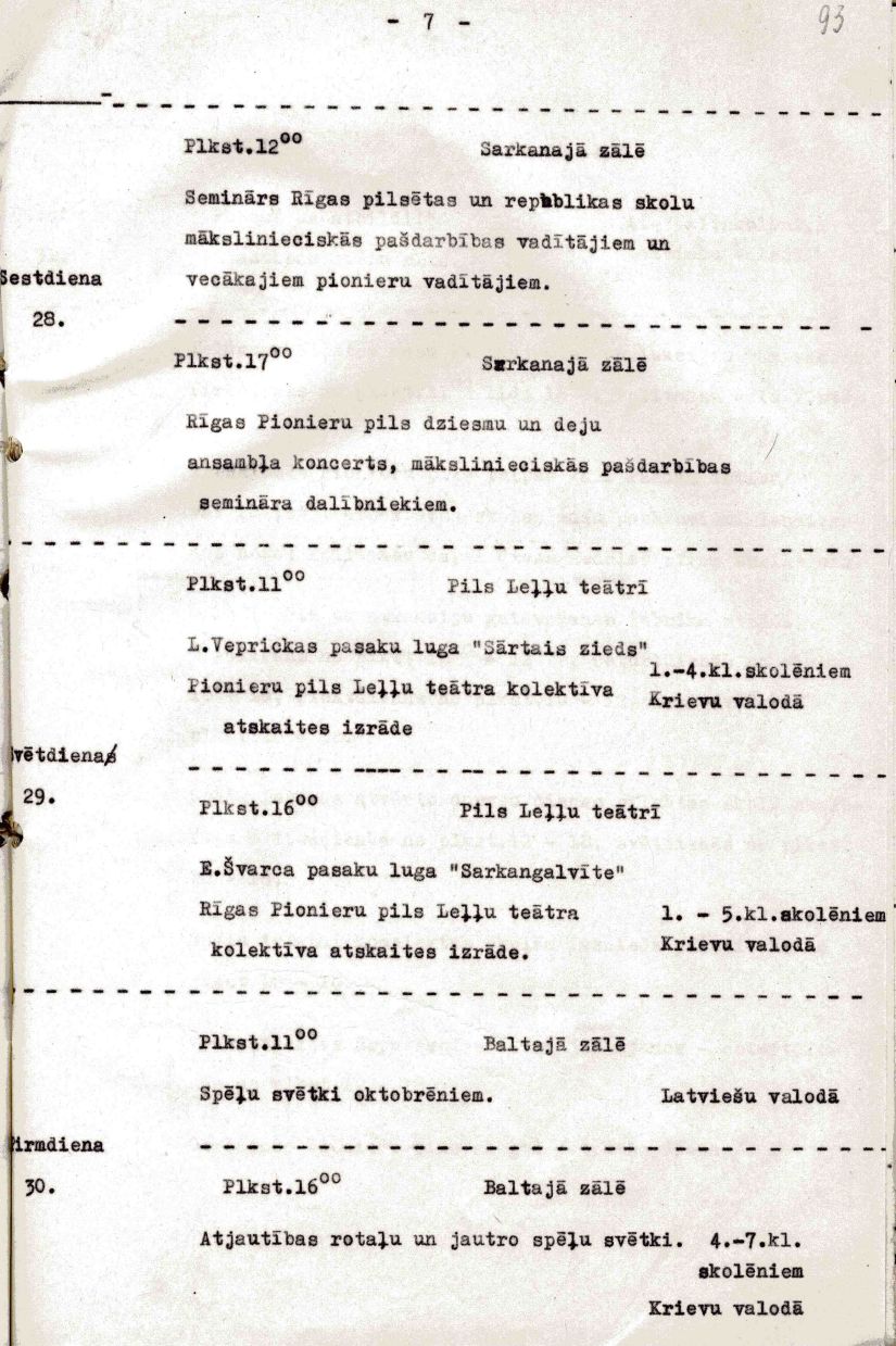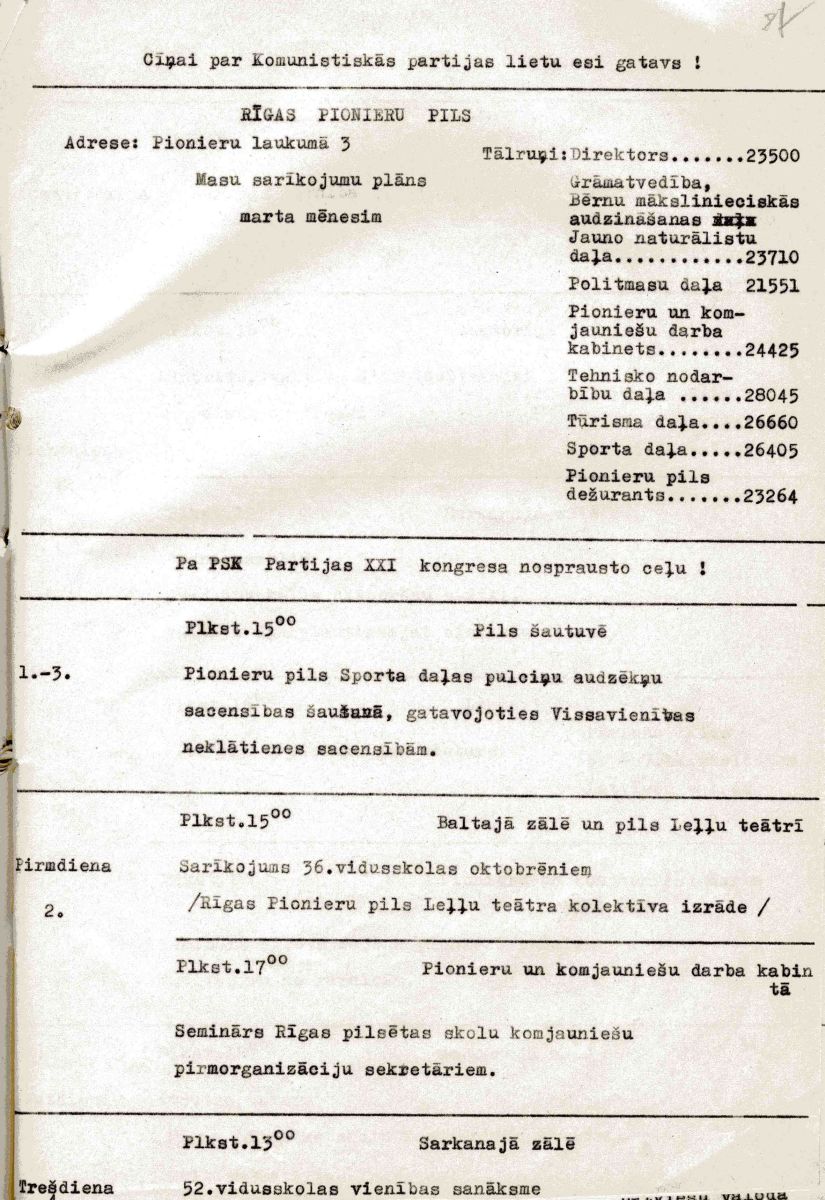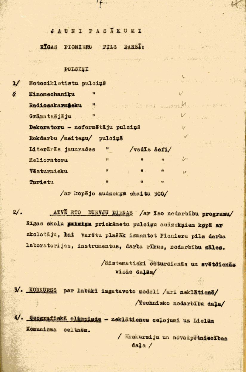 Rīgas Pionieru pils darba plāns 1956./57. mācību gadam iesniegts Rīgas pilsētas Darbaļaužu deputātu padomes izpildkomitejas Tautas izglītības nodaļā, saņemts 1956. gada 25. septembrī, apstiprināts 1956. gada 3. oktobrī.