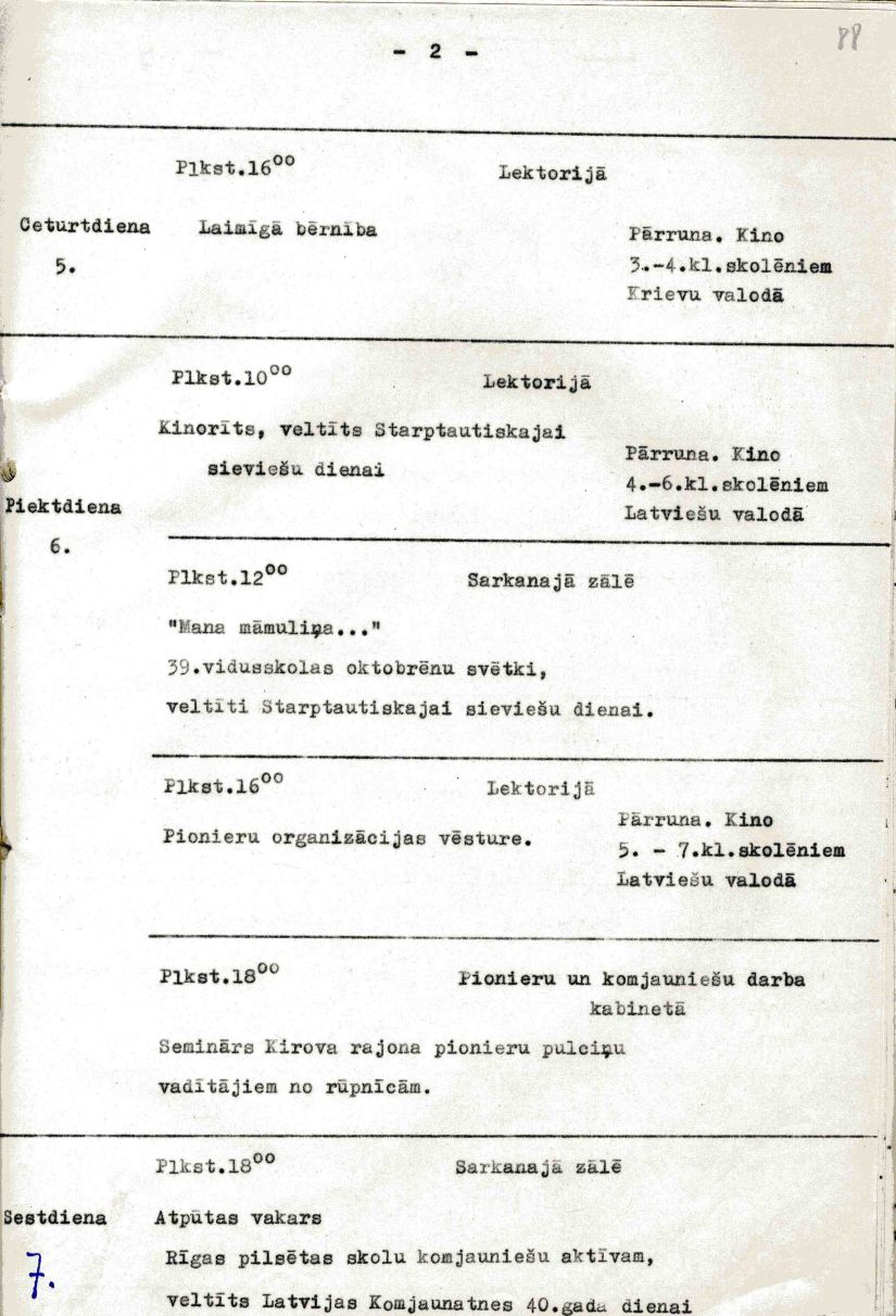 Lēmumā noteikts Latvijas PSR Pionieru pils nodot Rīgas pilsētas Darbaļaužu deputātu padomes izpildkomitejai un pārdēvēt par Rīgas Pionieru pili. |