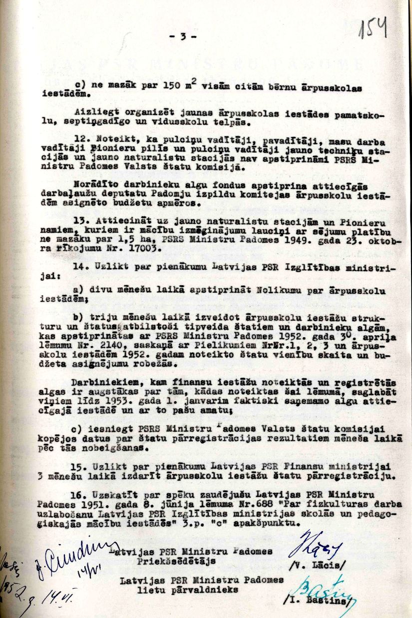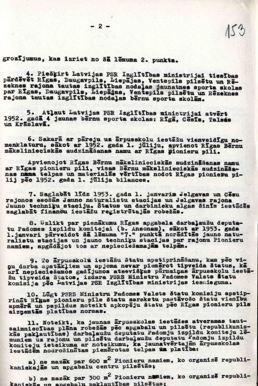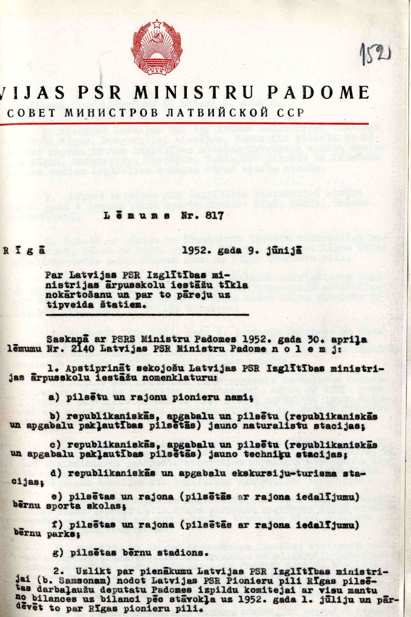 Latvijas PSR Ministru padomes lēmums par ārpusskolas iestāžu tīkla nokārtošanu un par to pāreju uz tipveida štatiem. 1952. gada 9. jūnijs.