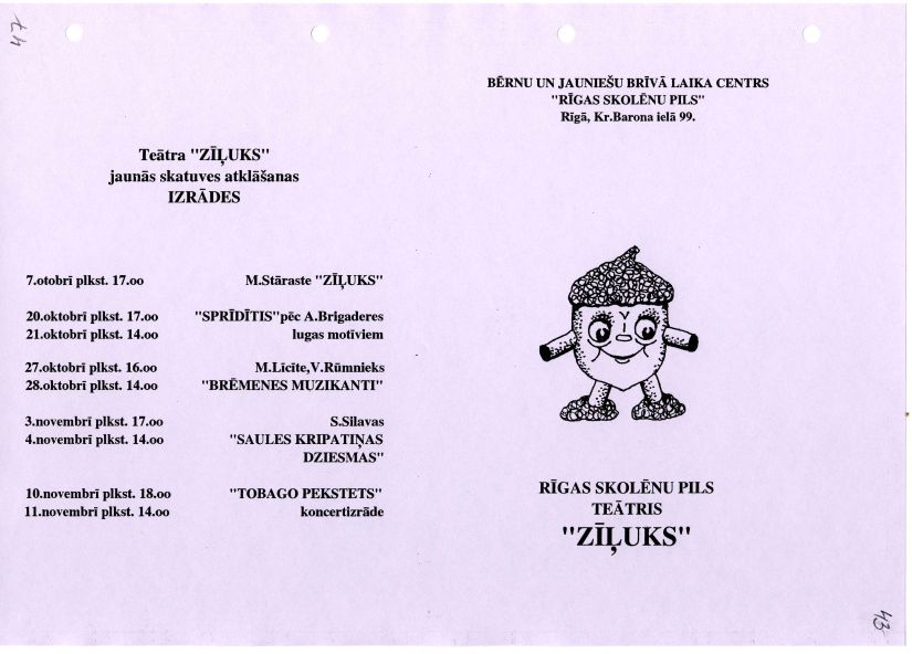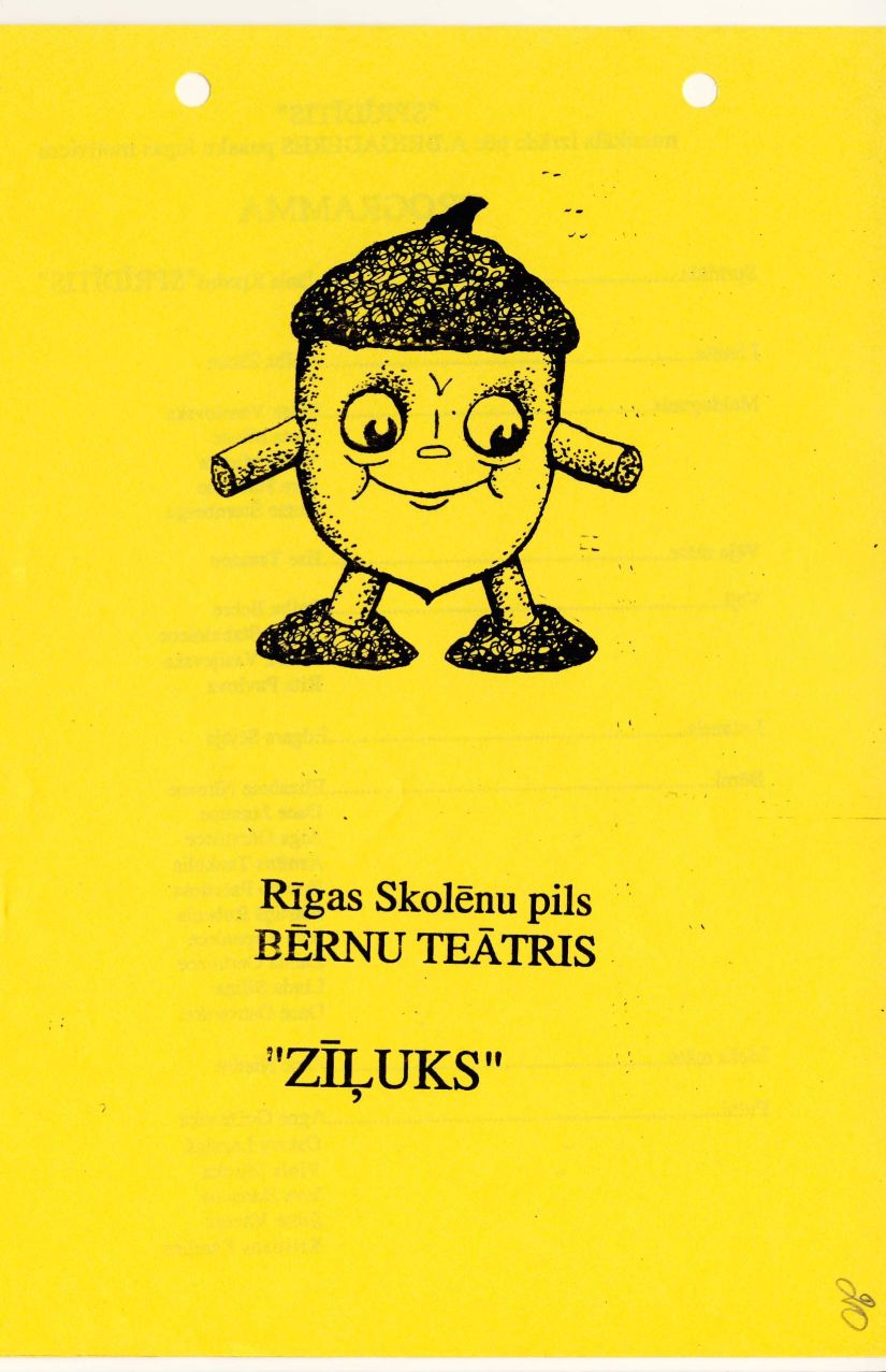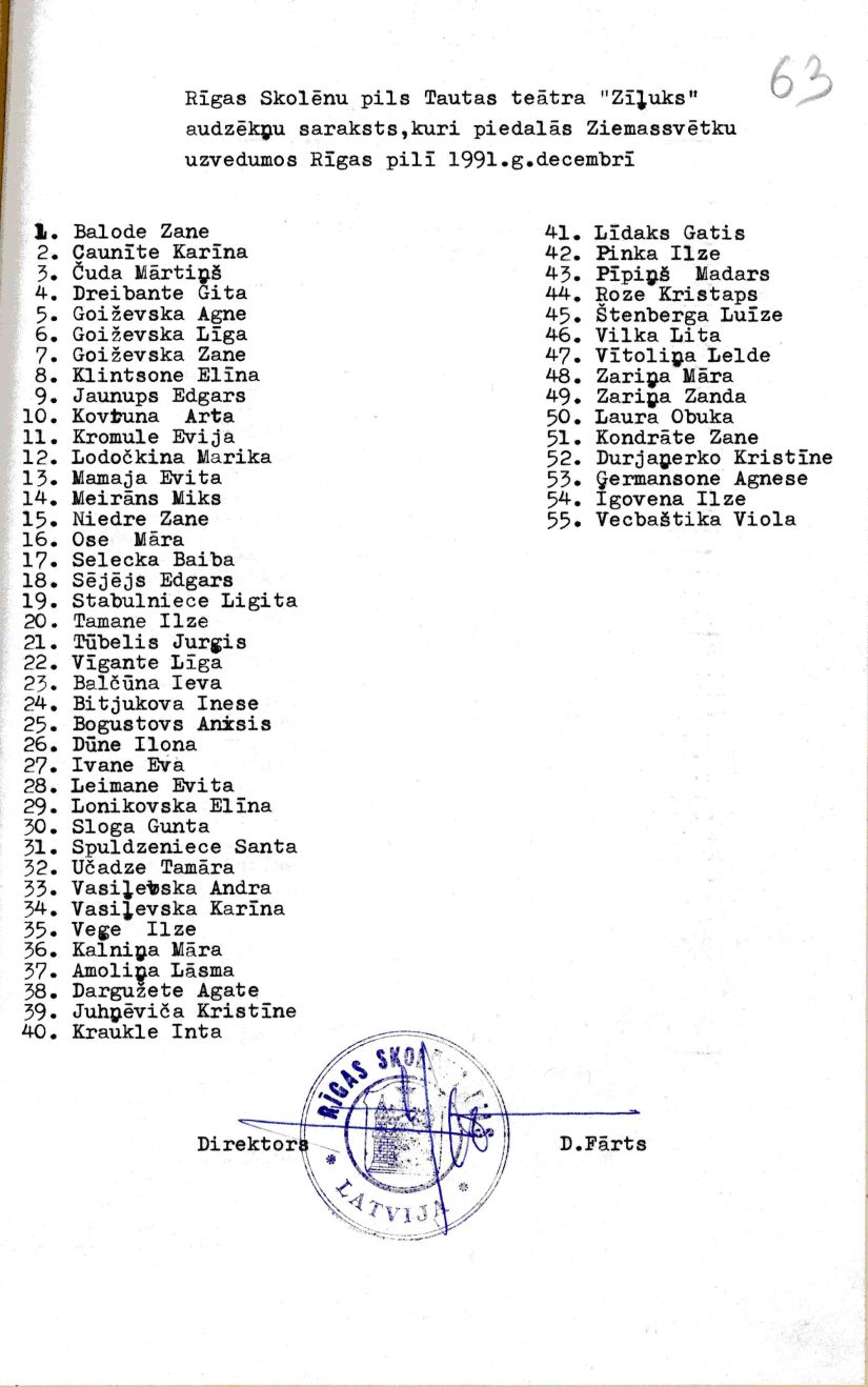 Rīgas Skolēnu pils Tautas teātra "Zīļuks" audzēkņu saraksts, kuri piedalās Ziemassvētku uzvedumos Rīgas pilī 1991. gada decembrī.