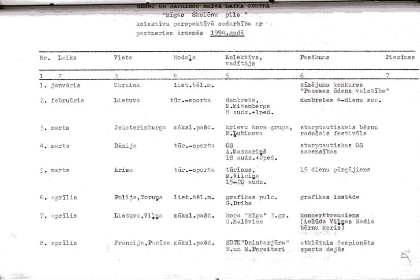 Rīgas Skolēnu pils perspektīvā sadarbība ar partneriem ārzemēs 1994. gadā.