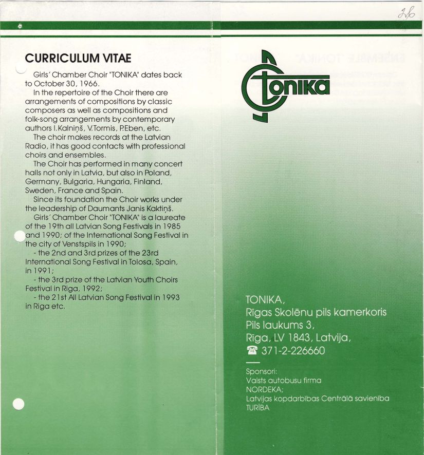 | Rīgas Skolēnu pils kamerkora "Tonika" buklets.