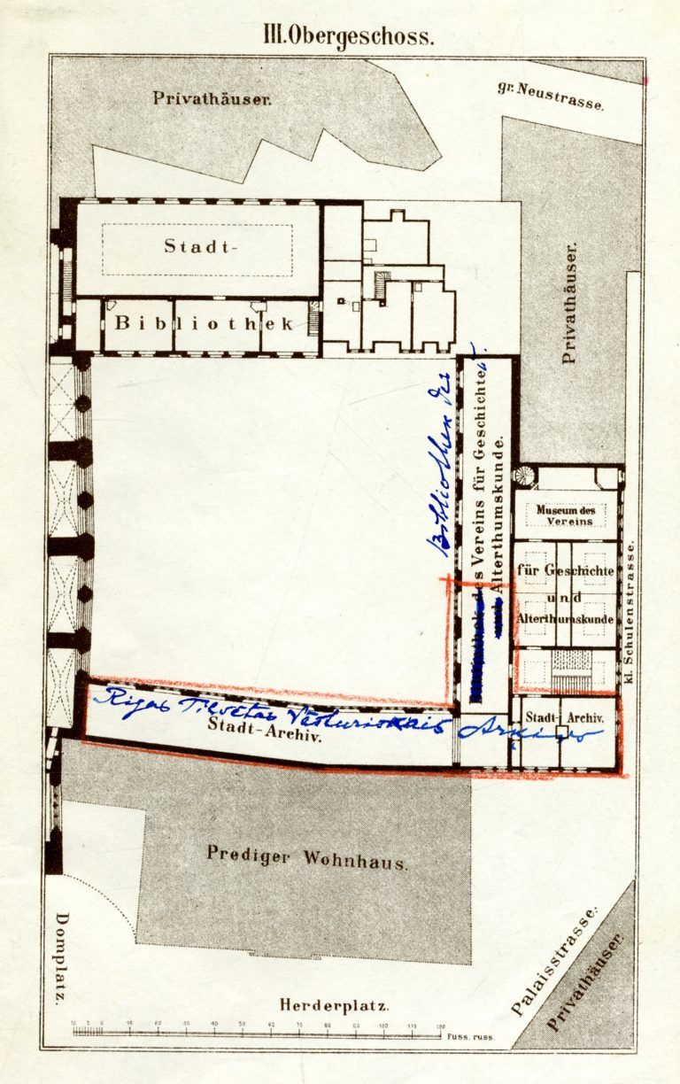 Doma muzeja trešā stāva plāns ar atzīmēm par pilsētas arhīva izvietojumu. Plāns publicēts: Orientierungs-Plän der Drei Stockwerke des Rigaschen Domklostermuseums. Riga, 1890. LNA_LVVA, F2661_1_59, 11. lp.