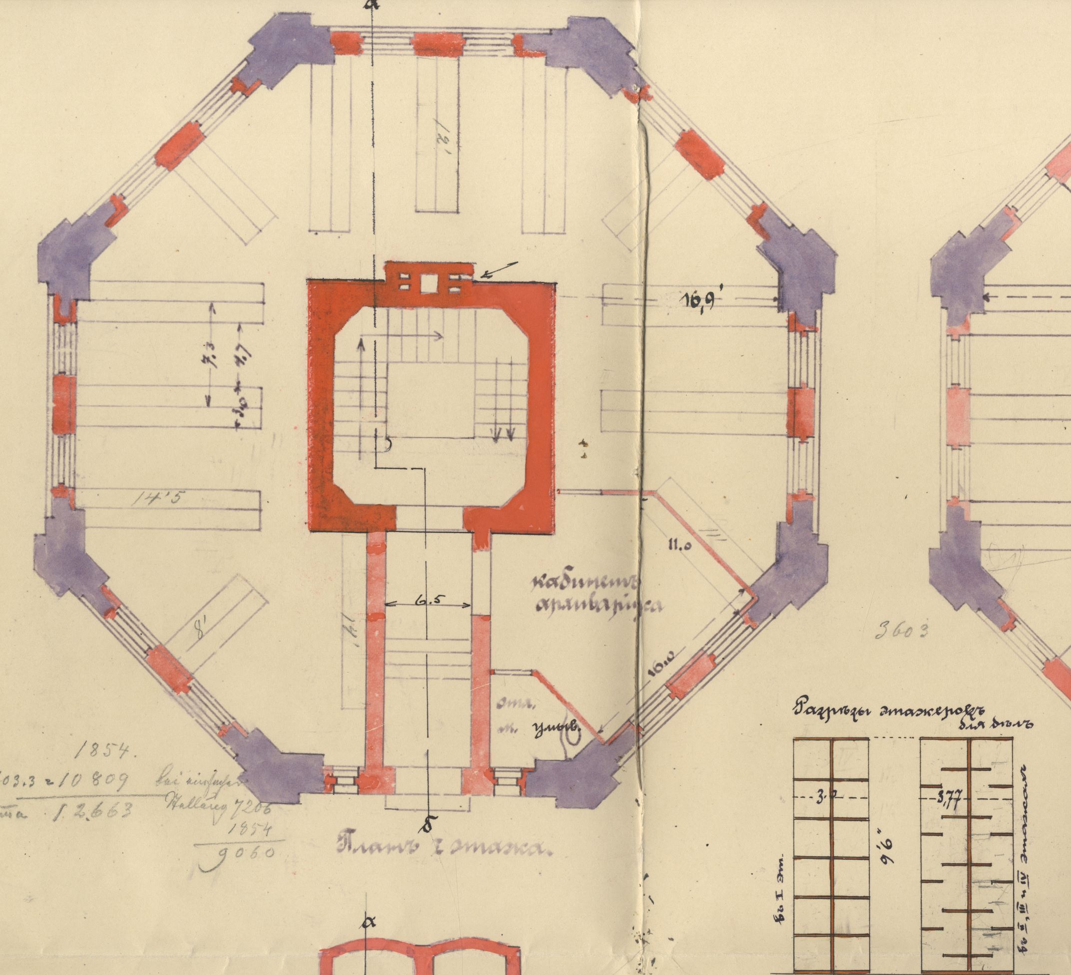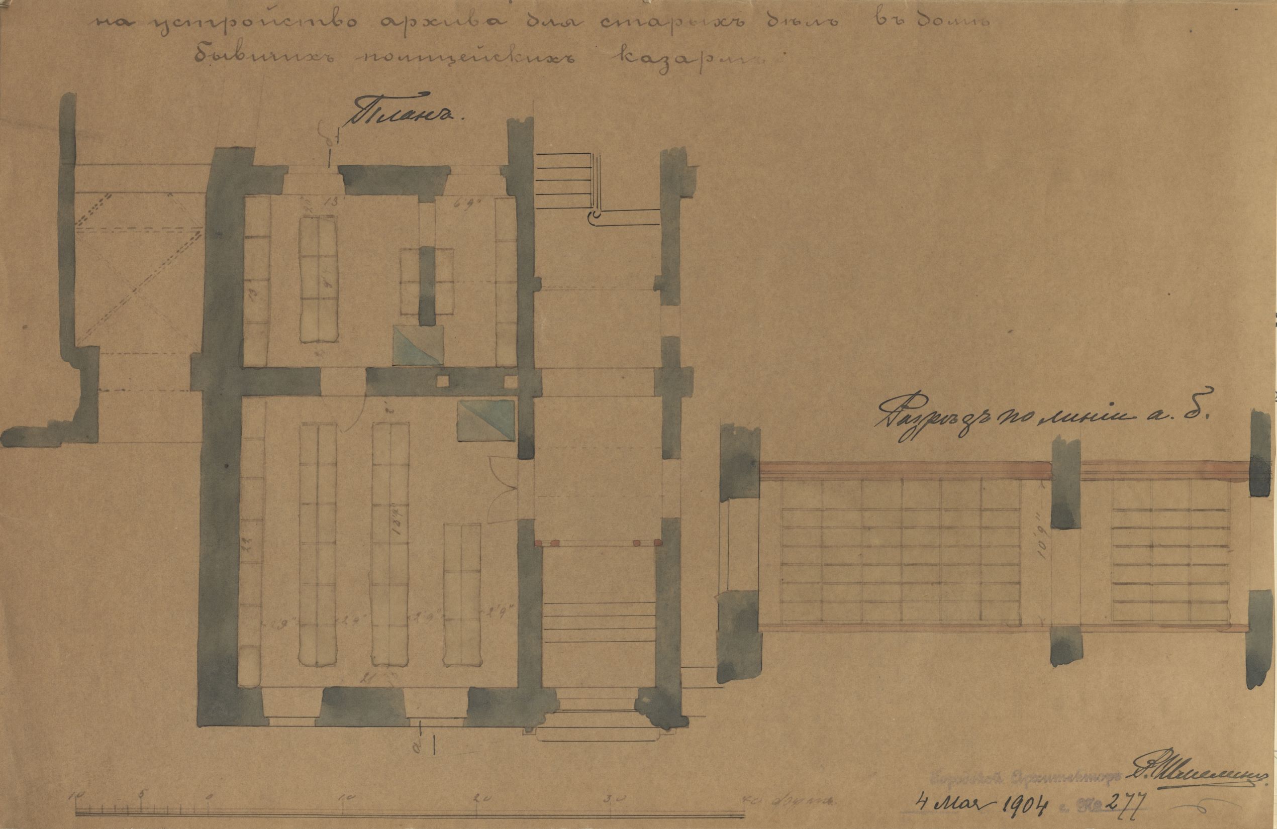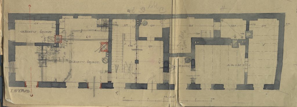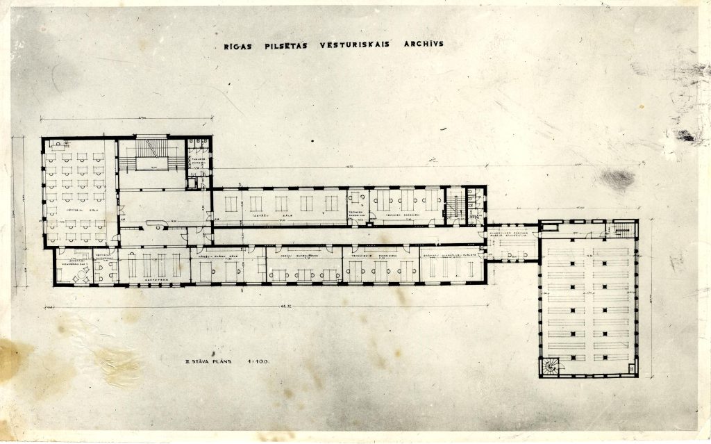 Projekts arhīva ierīkošanai Jāņa sētā 5. 1904. gads. Projekts par arhīva glabātavas izvietošanu kādreizējās policijas un cietuma telpās Jāņa sētā 5, sagatavots jau 1904. gadā, arhīvs telpas ieguva tikai īsti pirms Pirmā pasaules kara un izmantoja līdz 1924. gadam. LNA_LVVA, F2761_2_19, 6. lp.