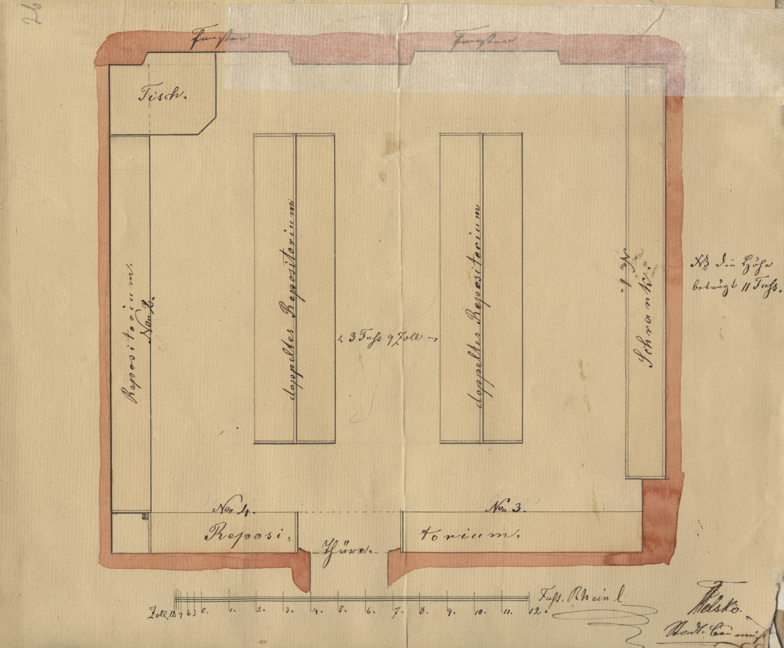 Dokumentu glabātavu iekārtošanas plāns Johana Daniela Felsko īstenotās rātsnama pārbūves laikā. 1848.–1850. gads. LNA_LVVA, F749_7_15, 26. lp.