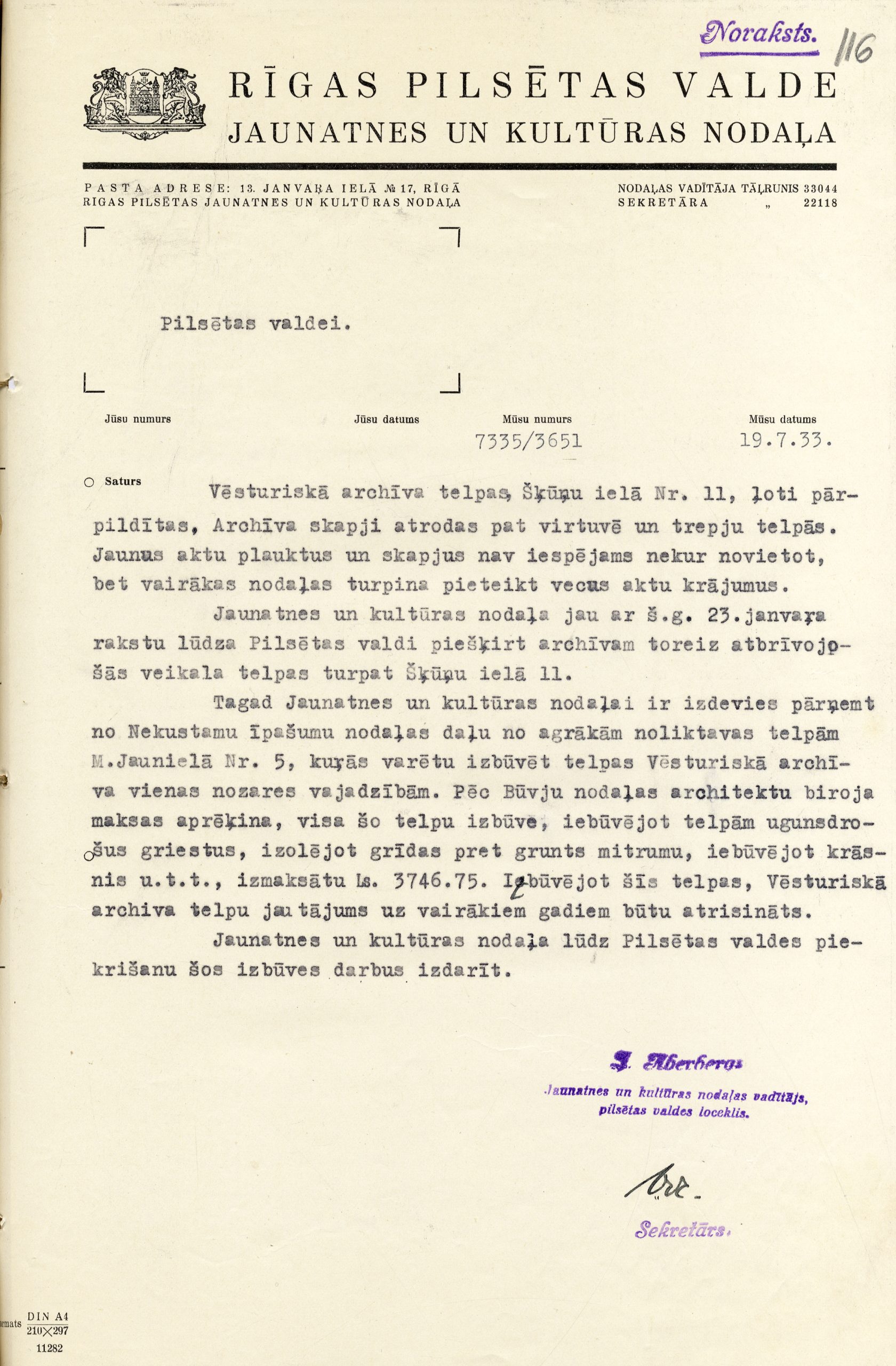 Rīgas pilsētas jaunatnes un kultūras nodaļas lūgums pilsētas valdei atļaut arhīva telpu izbūvi Mazajā Jaunielā 5. 1933. gada 19. jūlijs. LNA_LVVA, F3258_13_43, 116. lp.