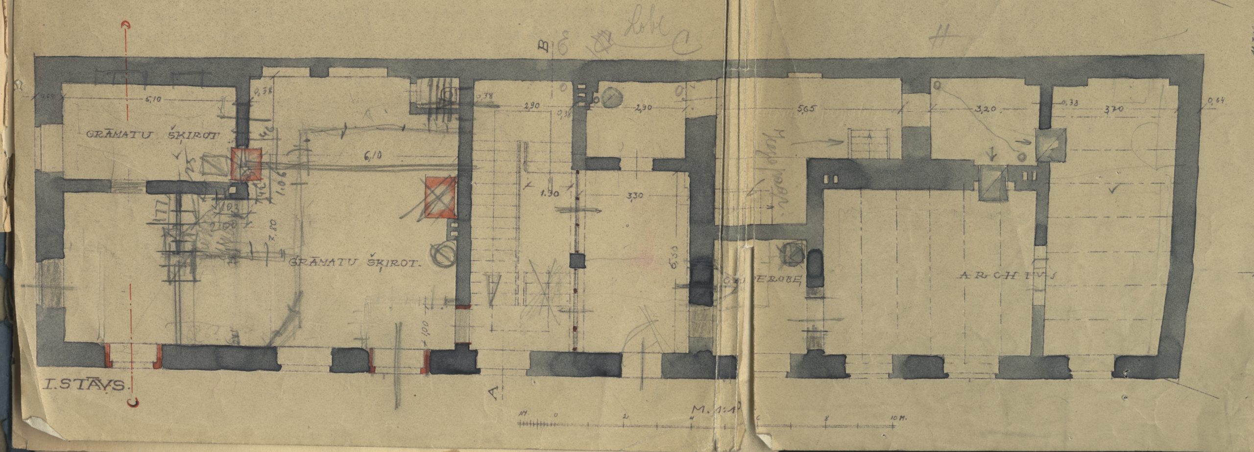 Ēkas Mazajā Jaunielā 5 pirmā stāva plāns ar atzīmēm par arhīva atrašanos un izvietojumu. 1933. gads. LNA_LVVA, F2761_3_857, 20. lp.