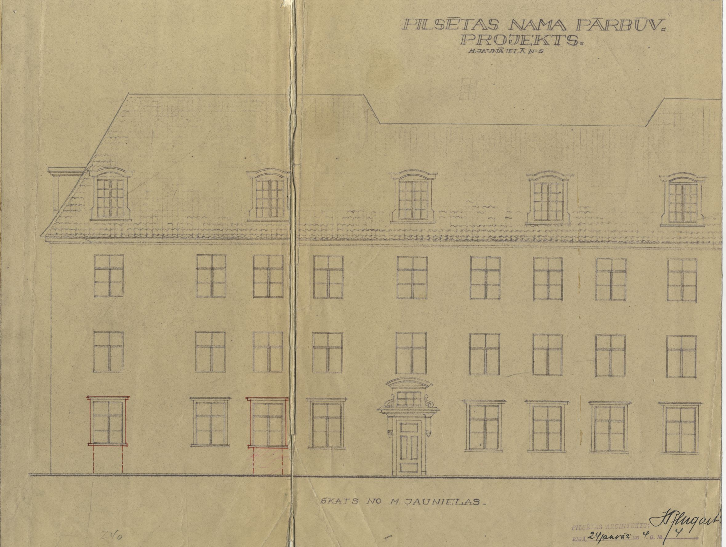 Ēkas Mazajā Jaunielā 5 fasādes zīmējums. 1933. gads. Ēkā atradās dažādas pilsētas iestādes. Arhīvs divas telpas pirmajā stāvā aizņēma no 1933. līdz 1940. gadam. LNA_LVVA, F2761_3_857, 20. lp.
