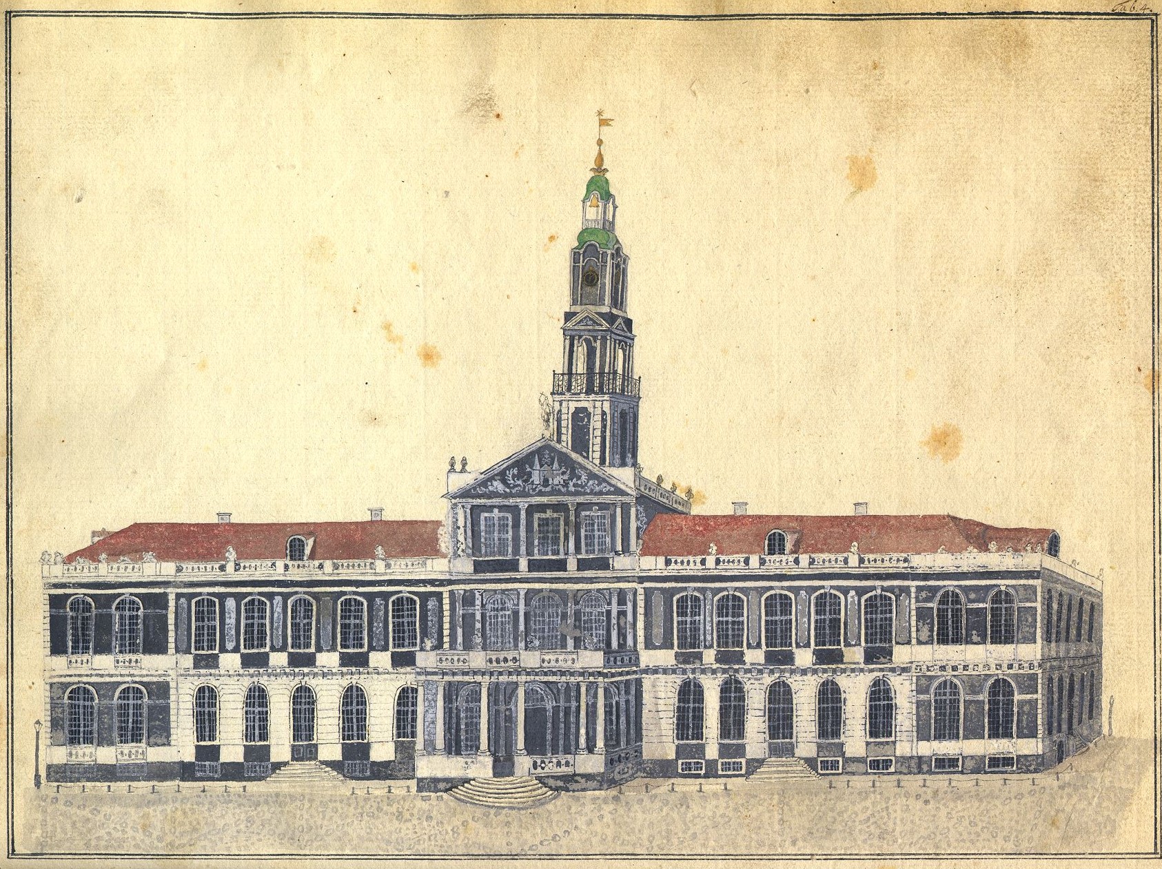 Rīgas rātsnams, celts laikā no 1750 līdz 1765. gadam. Gājis bojā Otrā pasaules kara laikā. Johana Andreasa Ēzena zīmējums. LNA_LVVA, F214_6_311a