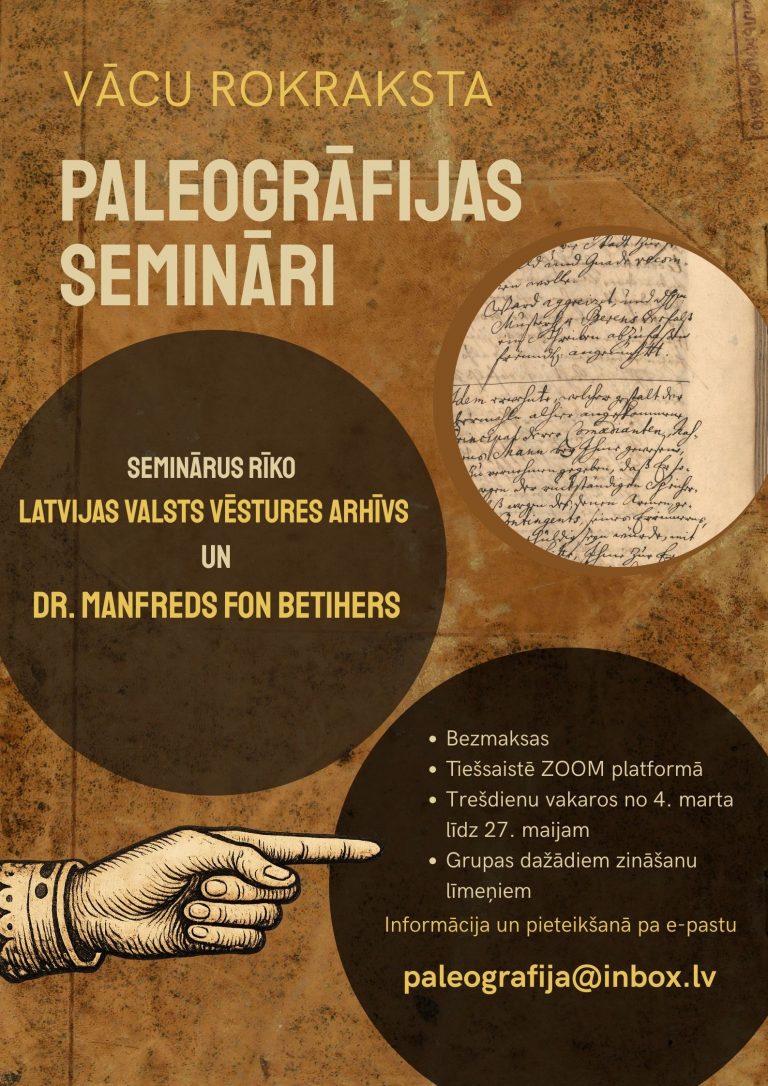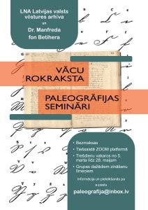 Latvijas Nacionālais arhīvs aicina apmeklēt Dr. Manfreda fon Betihera (Manfred von Boetticher) vadītos vācu rokraksta paleogrāfijas seminārus, kuros būs iespējams apgūt un padziļināt 17. – 19. gs. vācu rokraksta lasītprasmi. Zināšanas vācu rokrakstu atpazīšanā noderēs ikvienam vēstures interesentam un dzimtas pētniekam, kas strādā ar dokumentiem vācu valodā.