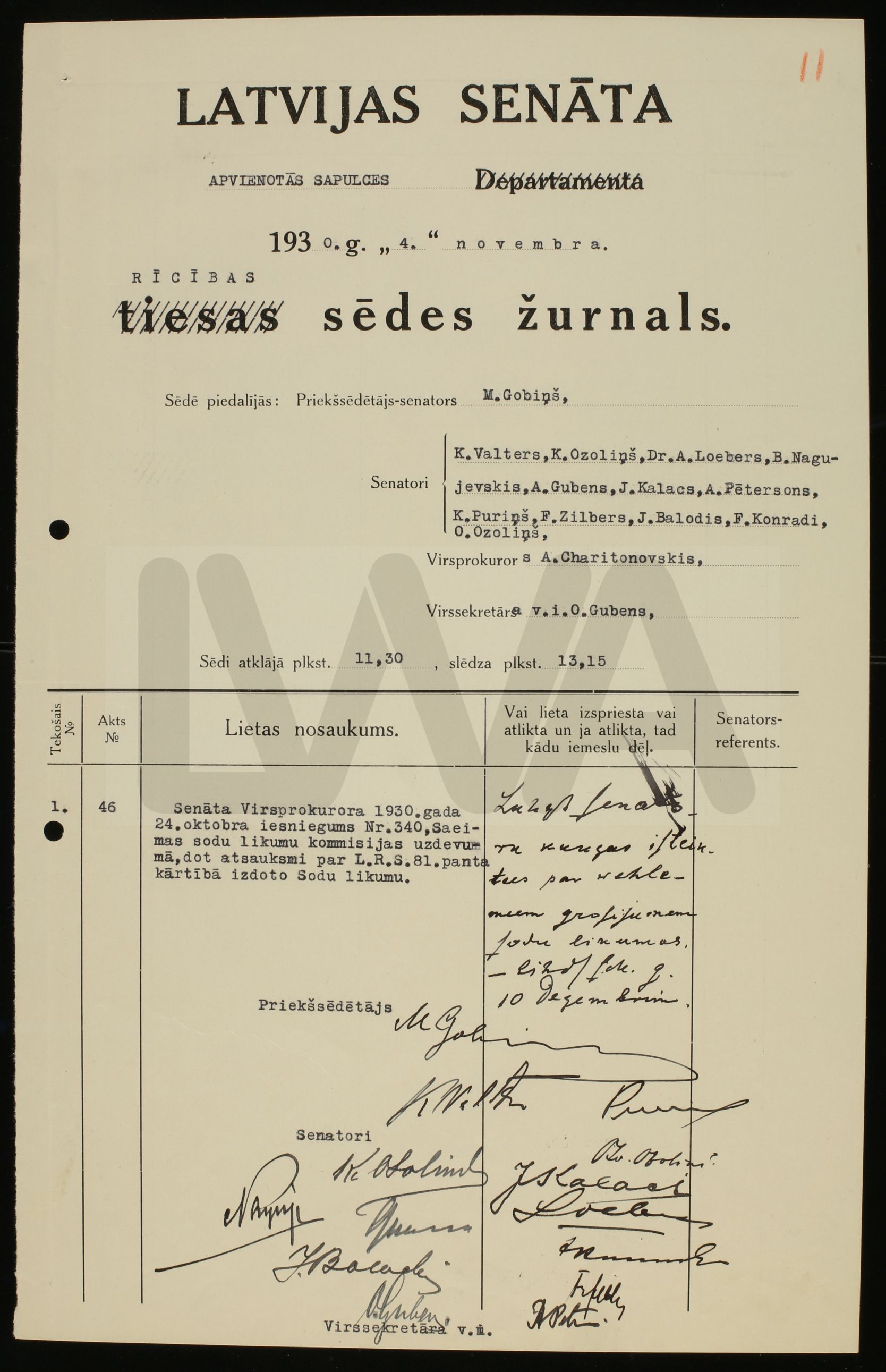 Latvijas Senāta Apvienotās Sapulces 1930. gada tiesas un rīcības sēžu žurnāli (LVVA 1535. f. 10. apr. 15. lieta)