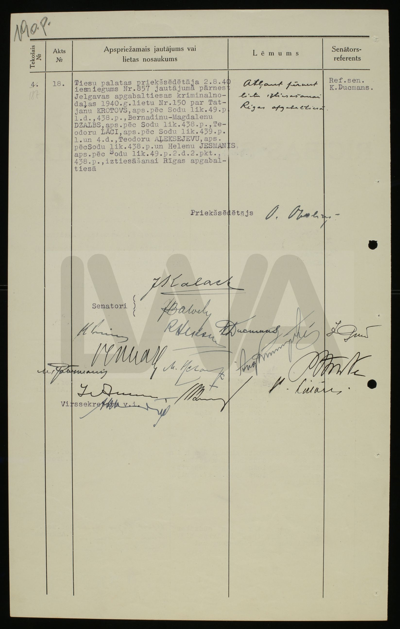 Latvijas Senāta Apvienotās Sapulces 1939.-1940. gada tiesas un rīcības sēžu žurnāli (LVVA 1535. f. 10. apr. 21. lieta)