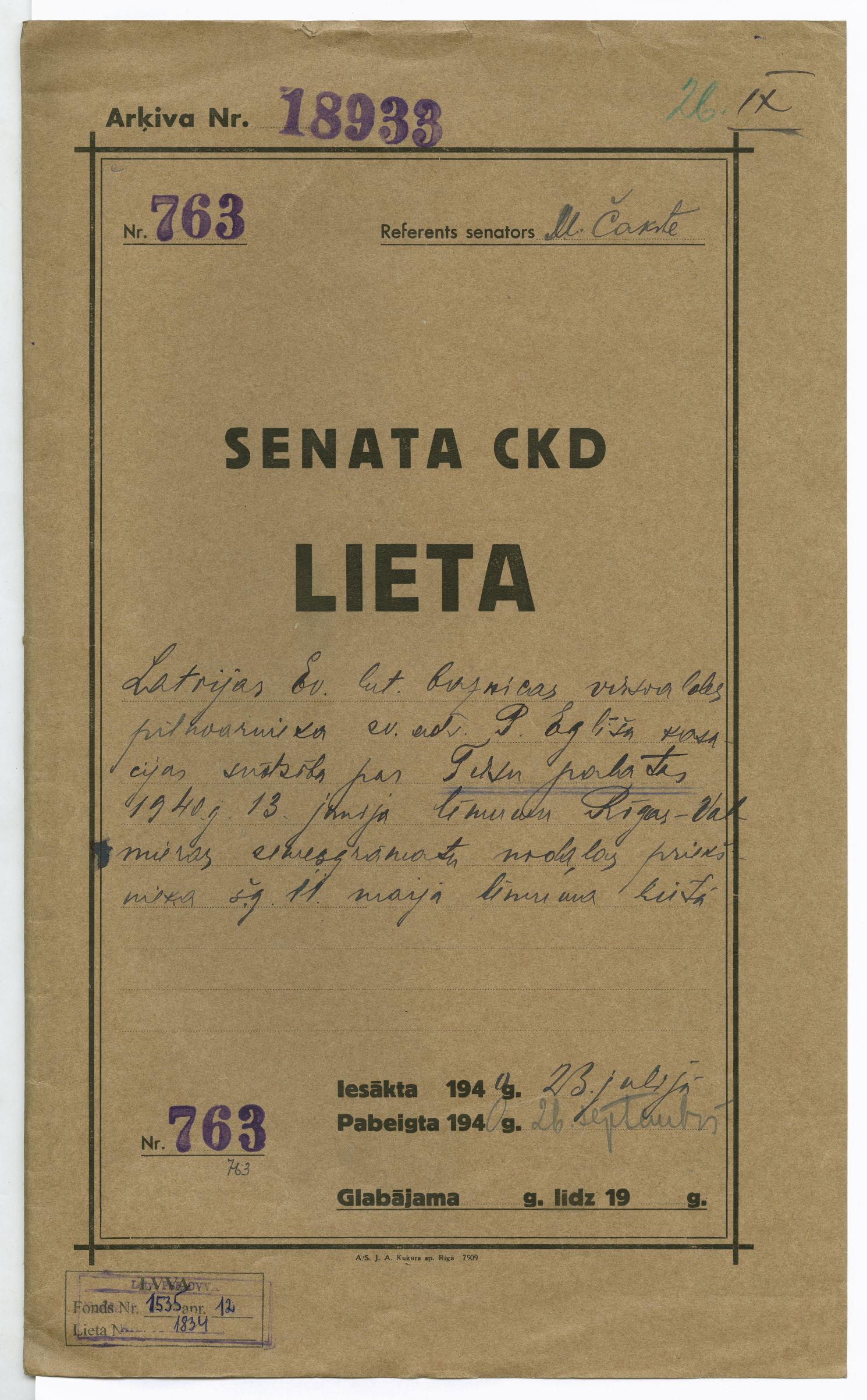 Latv. Ev. lut. Baznīcas virsvaldes pilnvarnieka sūdzība par Rīgas-Valmieras zemes grāmatu nodaļas priekšnieka lēmumu par nekustamā īpašuma Rīgā (I. hip. ar zemes gr. Nr.1071) nostiprināšanu (LVVA 1535. f. 12. apr. 1834. lieta)