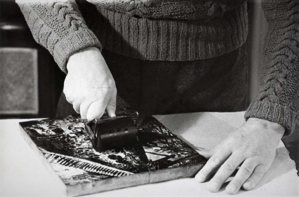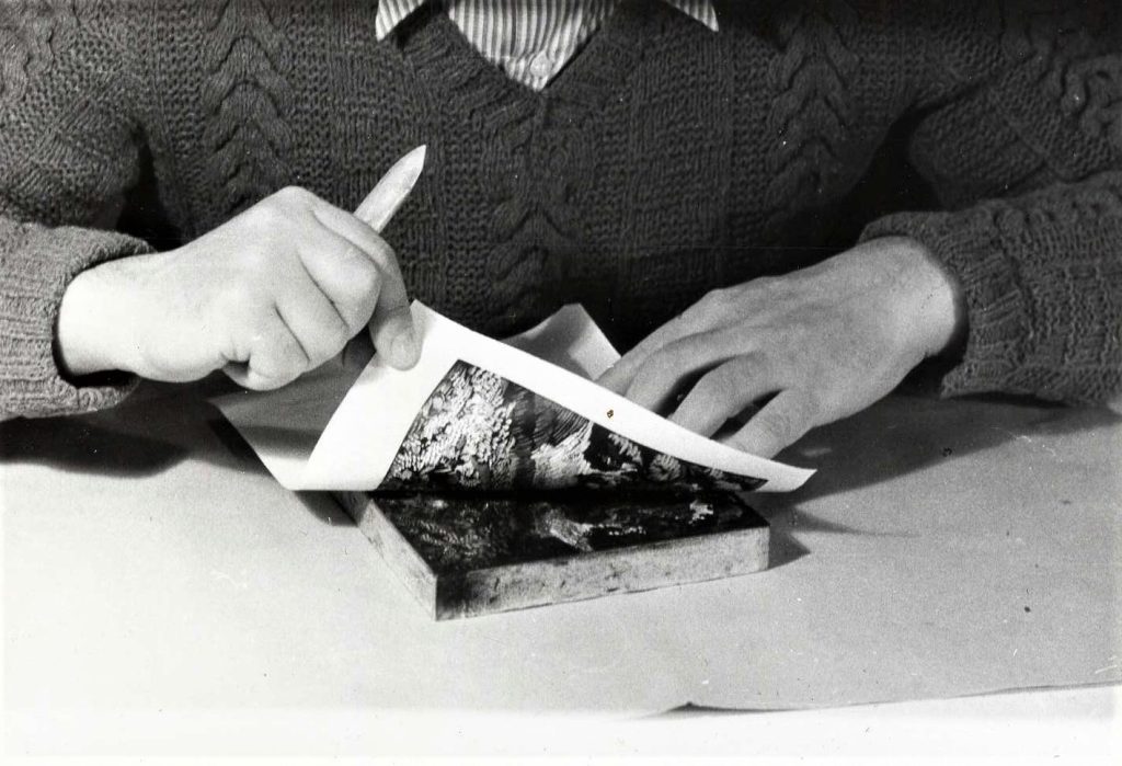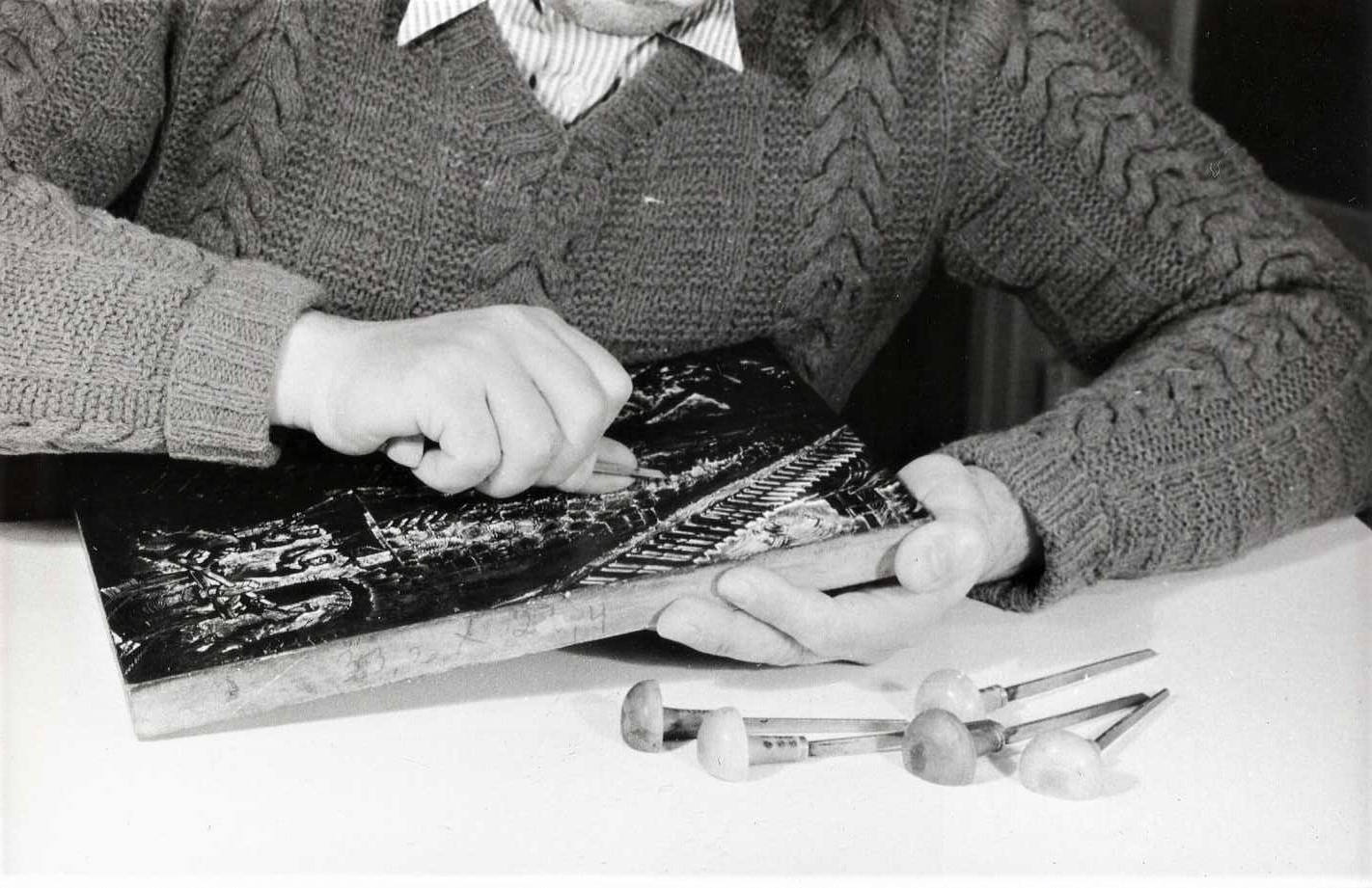 ”Viens no visvienkāršākajiem zīmējuma pārnešanas veidiem uz galdiņa ir sekojošs. Ar mīkstu zīmuli izgatavotais zīmējums tiek uzlikts otrādi uz galdiņa un no otras puses to pierīvē-pieberzē ar norīvējamo kauliņu, zobu birstes kātiņu vai metāla karoti. Zīmulis no papīra vienmēr gandrīz pilnīgi pāriet uz galdiņa, pēc tam to pārzīmē ar tušu. Iegūstot dzelumā zināmu praksi, vēlāk nav vajadzība vienmēr pārnesto zīmējumu izpildīt ar tušu. [..] Ja vienkāršs melnbalts zīmējums izgatavots uz plāna, caurspīdīga papīra, tad pārnešanu uz galdiņa var izdarīt sekojoši: viegli ar olu baltumu vai kartupeļu miltu klīsteri noziež galdiņu un uzliek zīmējumu otrādi (ačgārni) un viegli ar roku nogludina. Pēc nopūšanas galdiņa zīmējumu grebj kopā līdz ar papīru. Uz sagatavotā galdiņa zīmējumu var uznest ar zīmuli, ogļpapīru, tušu, melno krāsu, bet tā kā parasti zīmējums jāuznes otrādi, tad ir vairāki pārnešanas paņēmieni. Sarežģītāku zīmējuma pārnešanu var izdarīt sekojoši: uz caurspīdīga pārveduma papīra ar ķīmisko litogrāfijas tušu uznes zīmējuma kontūras, pēc tam to apgriež otrādi, uzliek uz galdiņa un zīmējumu no mugurpuses pierīvē. Jaunākā laikā viens no iecienītākiem zīmējuma pārnešanas paņēmieniem uz galdiņa ir sekojošs. Ņem biezāku celofāna papīru vai celuloīda, visbiežāk siltā ūdenī un ar ziepēm nomazgātas rentgena uzņēmuma plates uzliek uz vajadzīgā zīmējuma un ar asu adatu viņā ieskrāpē zīmējuma kontūras. Ar kāsi mazliet iekasītos līniju asumus viegli nogludina un piespiež ar sangīnu. Sagatavoto kontūras zīmējumu uzliek uz galdiņa ačgārni un no mugurpuses to pierīvē. Visi ieberztie esošie sangīnas putekļi pieķersies galdiņa pamatnei, tā pārnesdami vajadzīgo zīmējumu uz galdiņa. [..] Daži mākslinieki savus zīmējumus uzfotografē uz koka, tomēr ieteicams tas nav, jo tas padara darbu nedzīvu un neatļauj izvērsties jaunradei.”