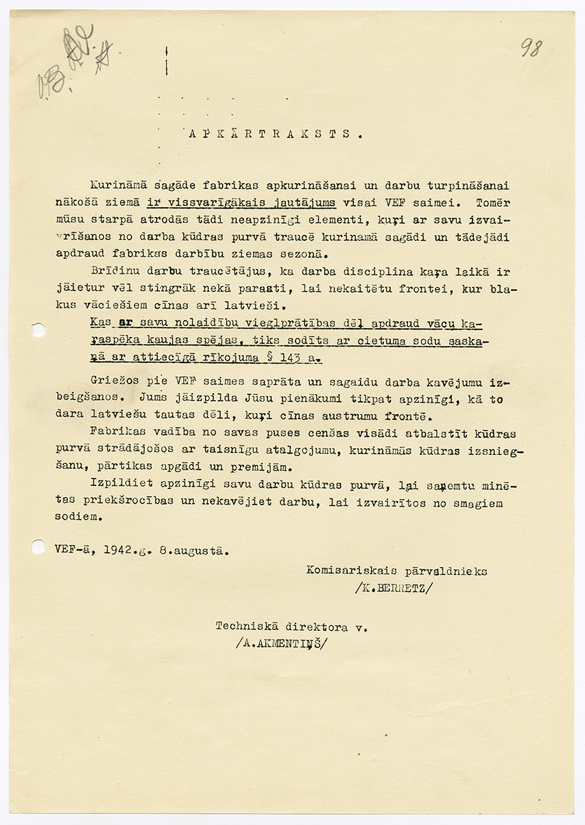 No inženiera Olafa Damberga atmiņām: “Karš pārsteidza VEF administrāciju nesagatavotu. Nemaz nebija gatavots tāds variants kā evakuācija! Netika evakuēti ne materiāli, ne tehnika, ne tehniskie darbinieki. VEF progresīvie tehniskie darbinieki tika izolēti no iekšējām izmaiņām rūpnīcas politiskajā un sabiedriskajā dzīvē – tas arī izrādījās, ka individuāli evakuējusies pavisam neievērojama daļa tehnisko darbinieku.”